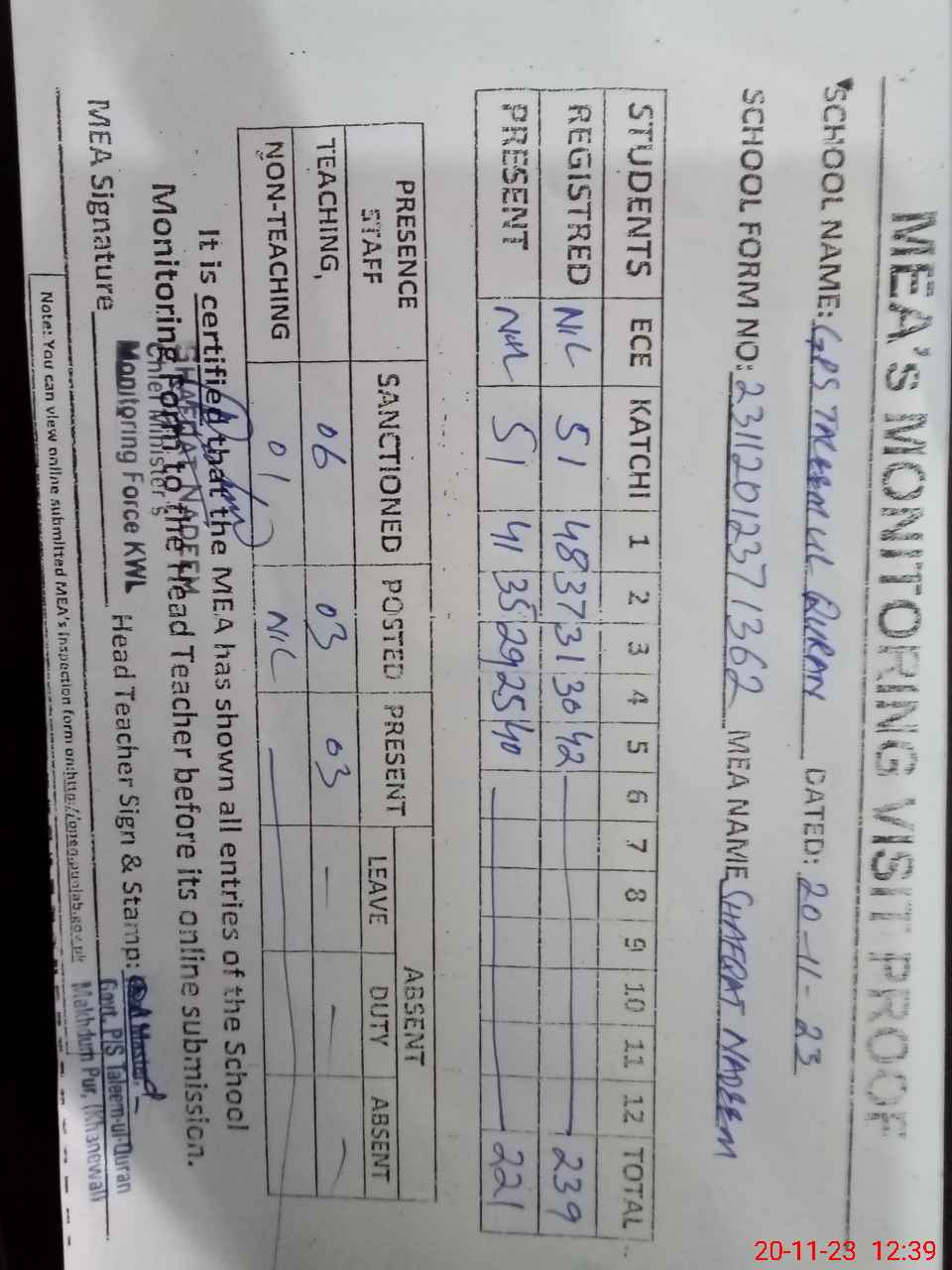 | Attendance Register | Head Teacher | MEA with School | Visit Proof |