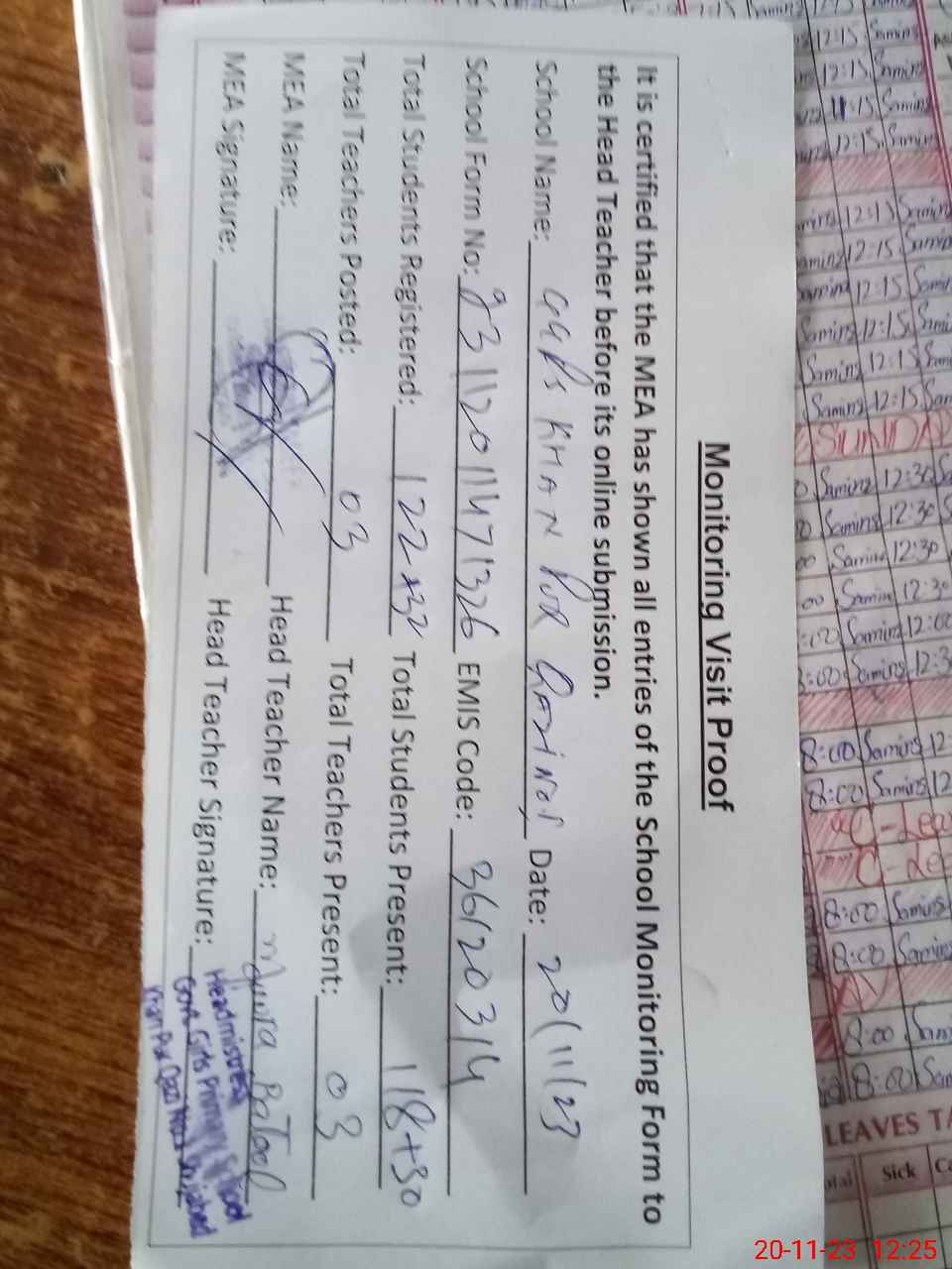 | Attendance Register | Head Teacher | MEA with School | Visit Proof |