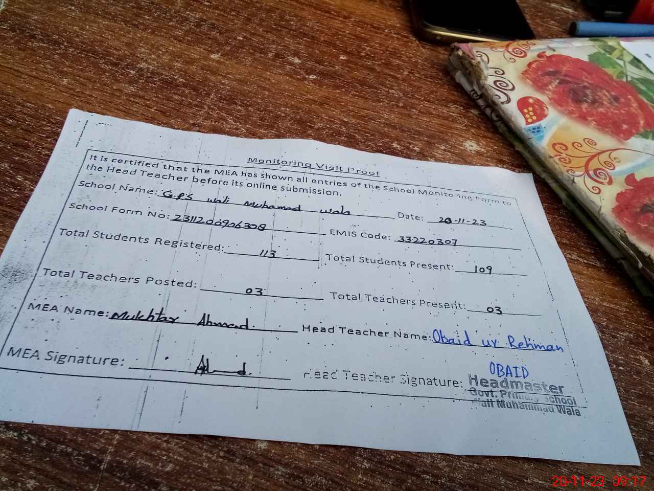 | EMIS Code: 33220307 | Name of School: GPS WALI MOHAMMAD WALA | |||