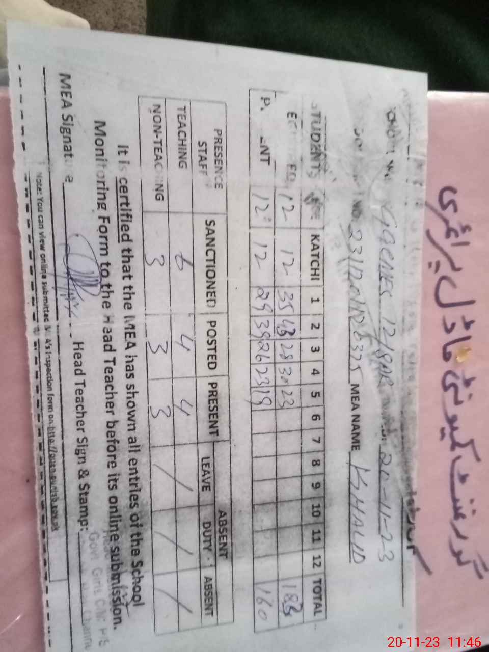 | Attendance Register | Head Teacher | MEA with School | Visit Proof |