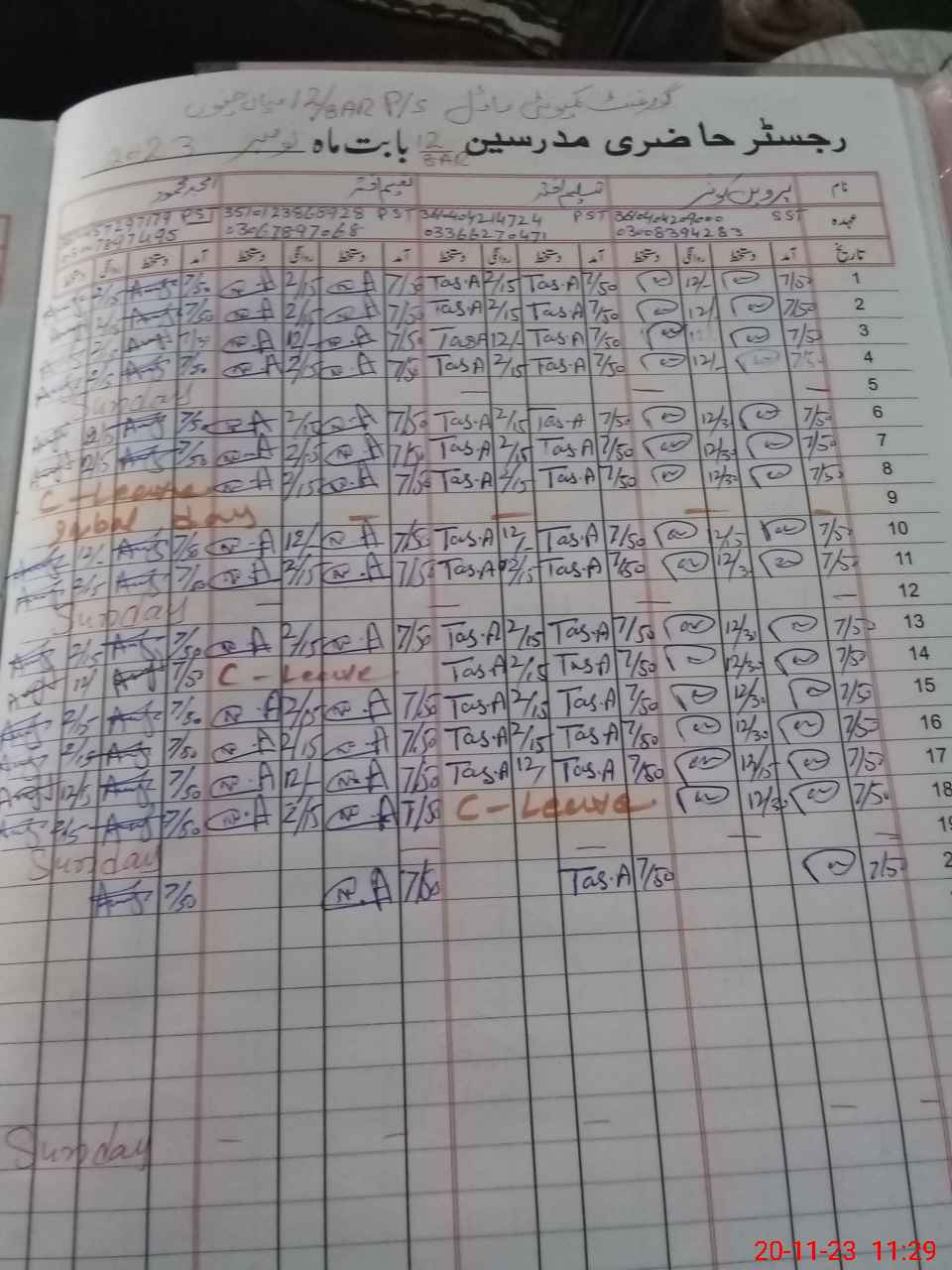| CNIC | Full Name | Designation | R/C | Absence During Last Calender Month |