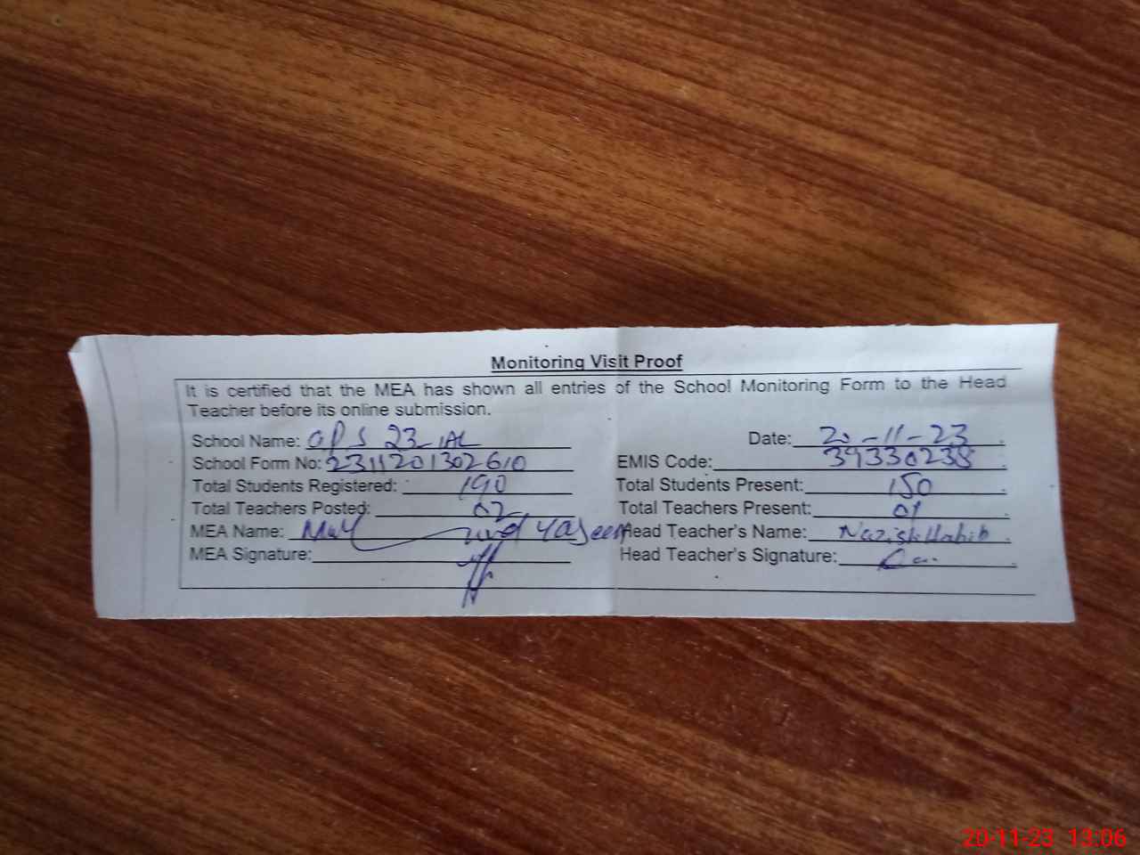 | Attendance Register | Head Teacher | MEA with School | Visit Proof |
