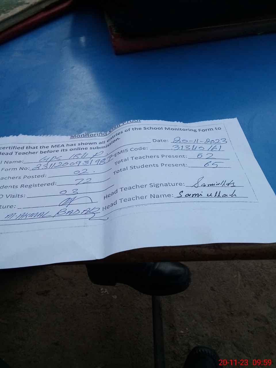 | Attendance Register | Head Teacher | MEA with School | Visit Proof |