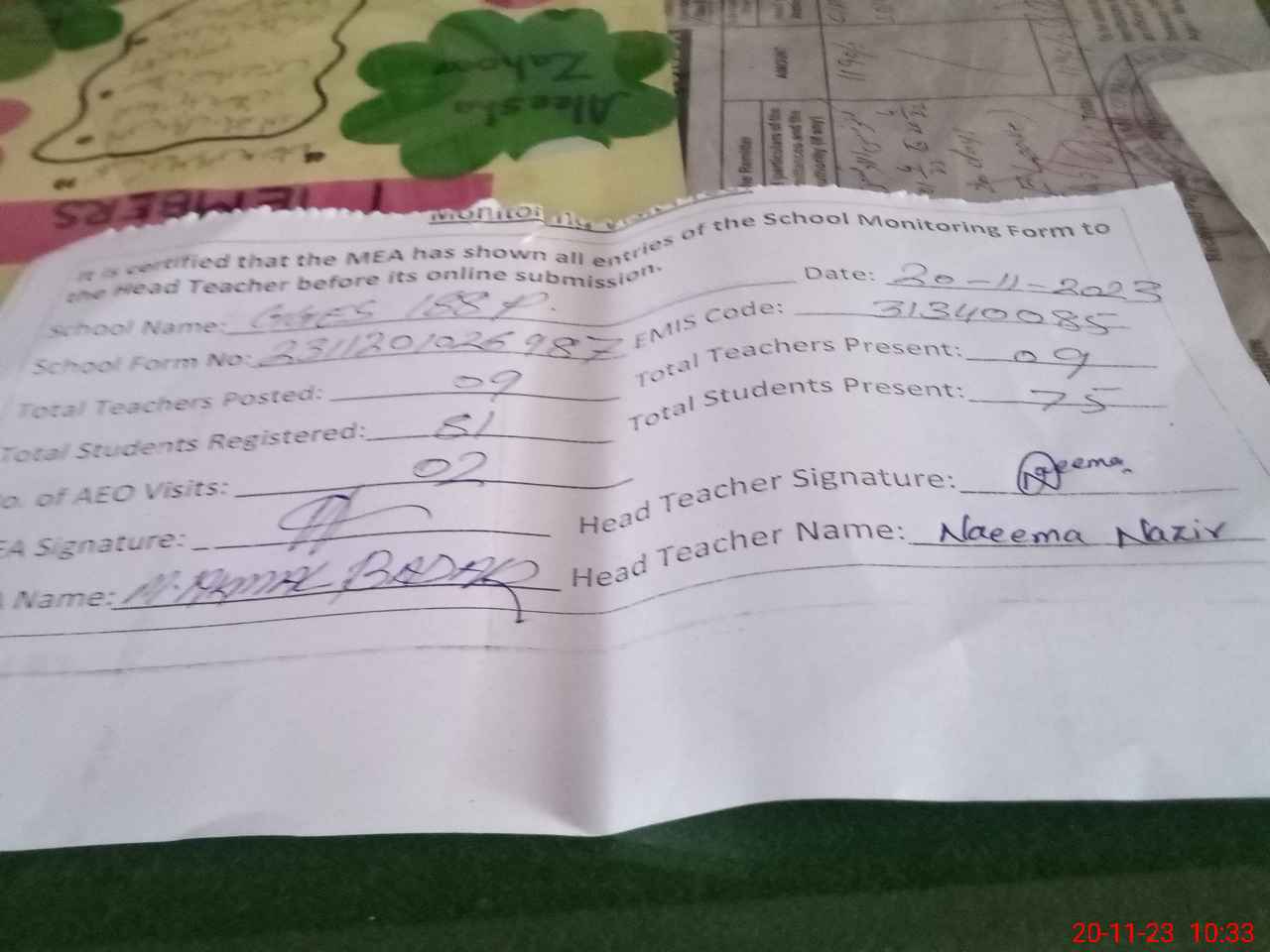 | Attendance Register | Head Teacher | MEA with School | Visit Proof |
