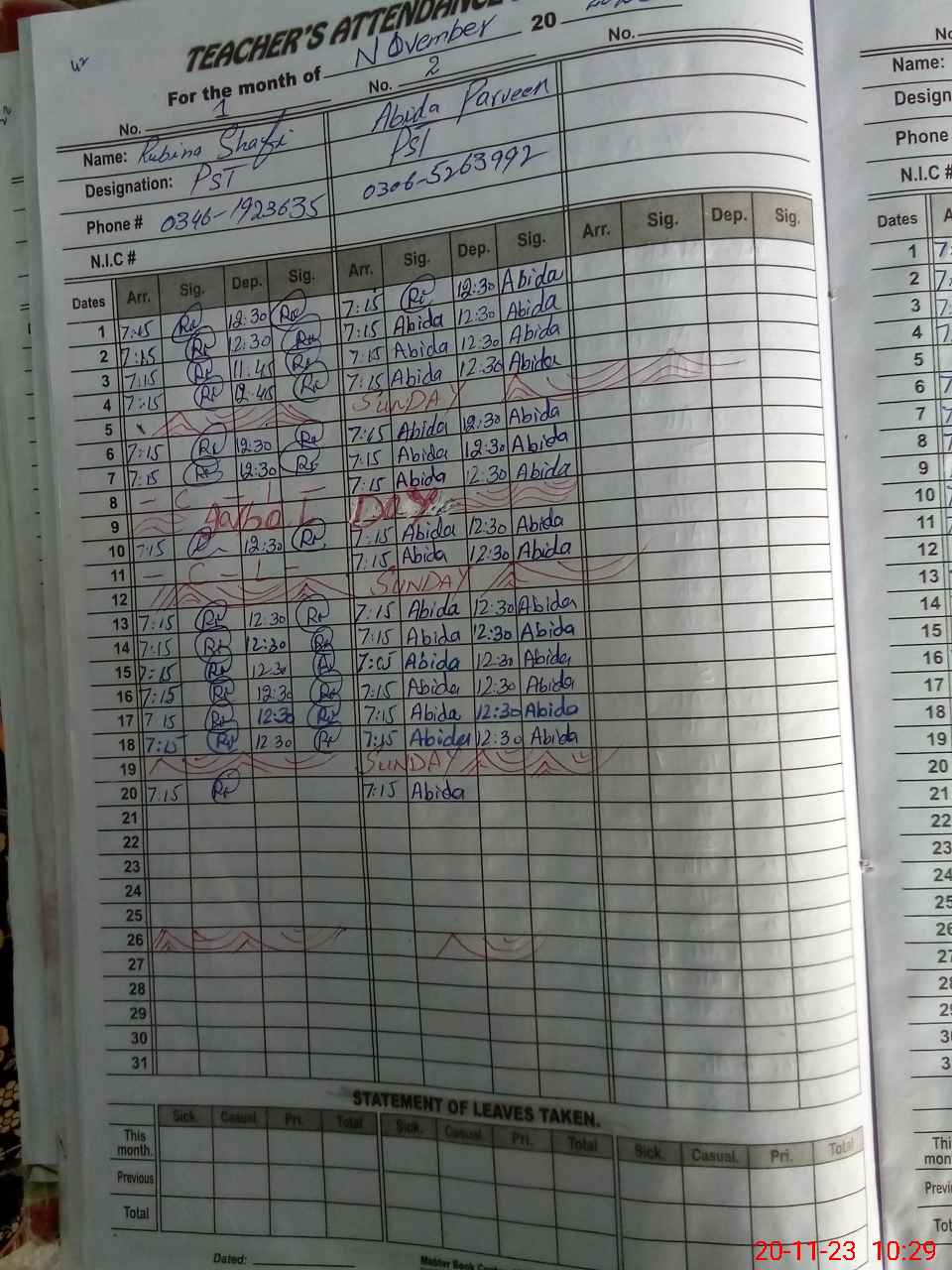 | CNIC | Full Name | Designation | R/C | Absence During Last Calender Month |