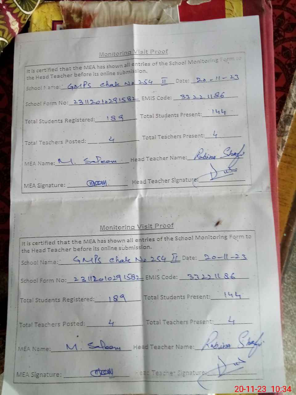 | Attendance Register | Head Teacher | MEA with School | Visit Proof |