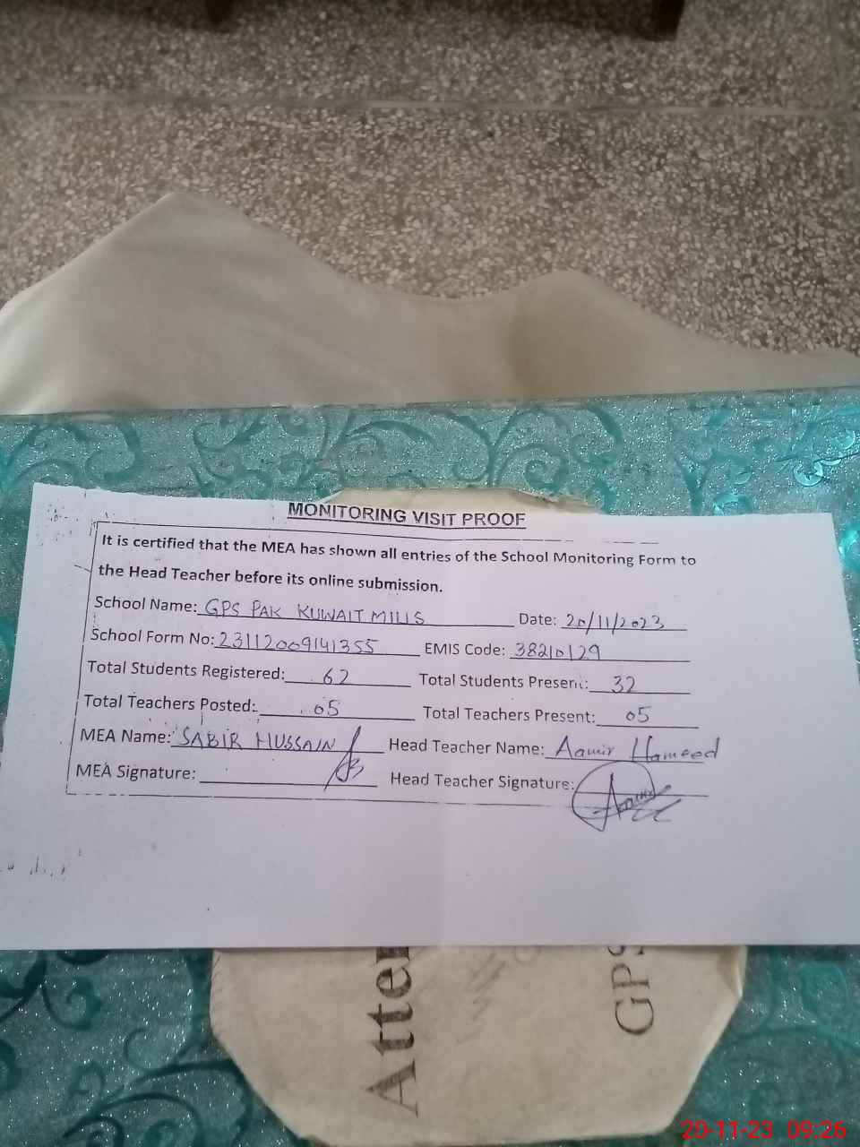 | EMIS Code: 38210129 | Name of School: GPS PAK KUWAIT MILLS KHUSHAB | |||
