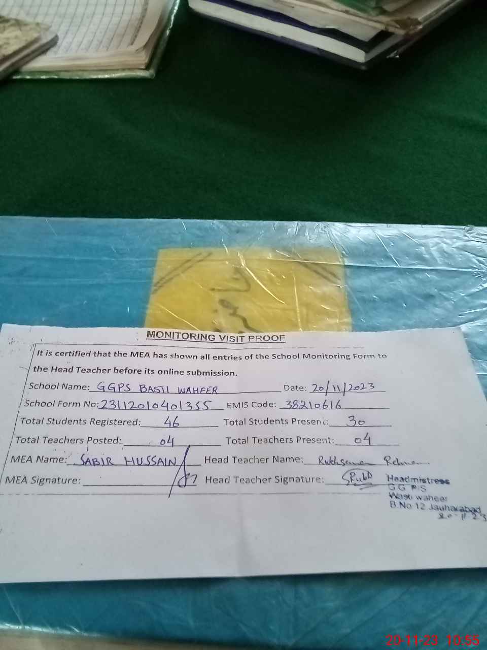 | Attendance Register | Head Teacher | MEA with School | Visit Proof |