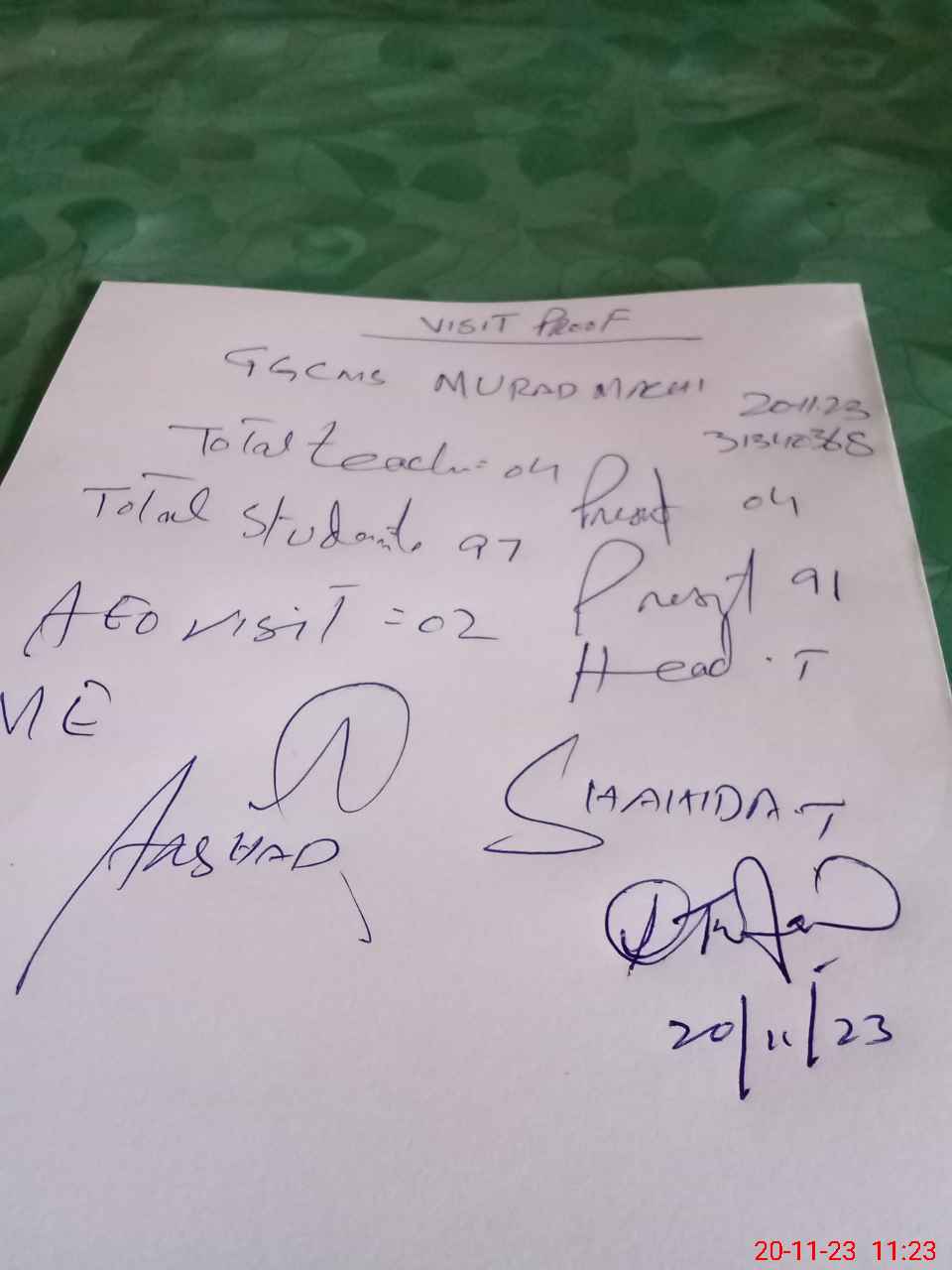 | Attendance Register | Head Teacher | MEA with School | Visit Proof |