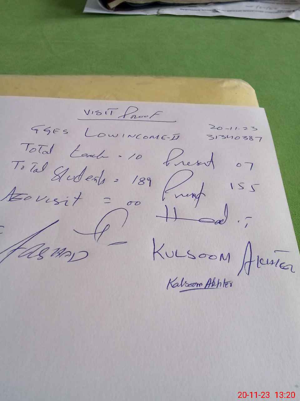 | Attendance Register | Head Teacher | MEA with School | Visit Proof |