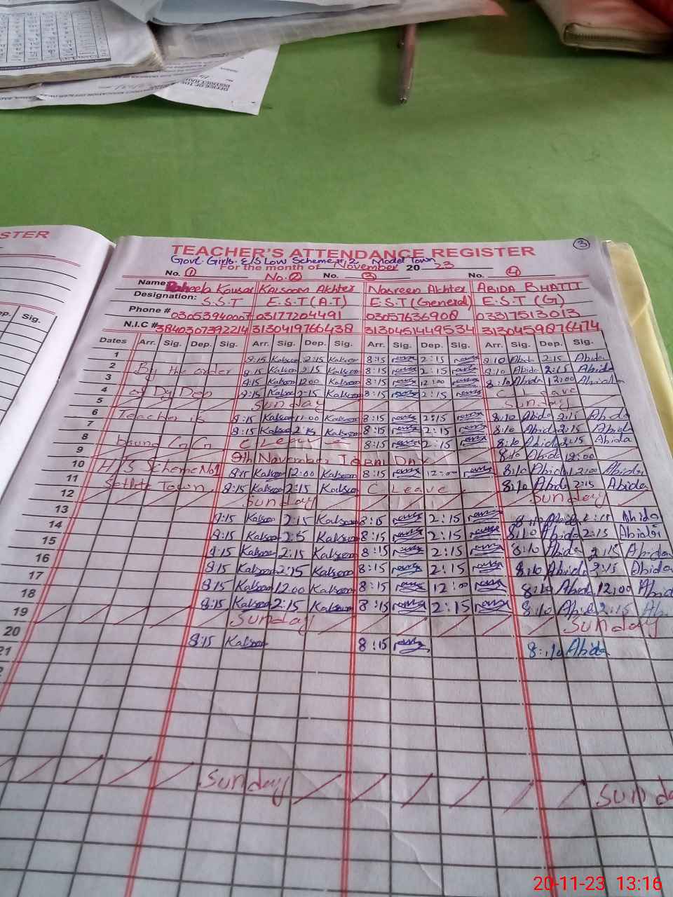 | CNIC | Full Name | Designation | R/C | Absence During Last Calender Month |