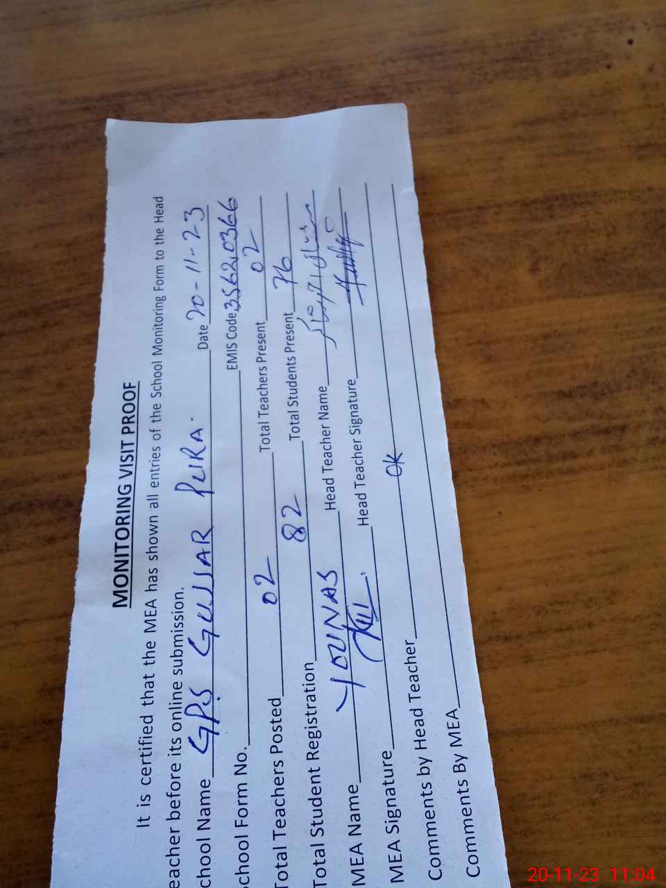 | Attendance Register | Head Teacher | MEA with School | Visit Proof |