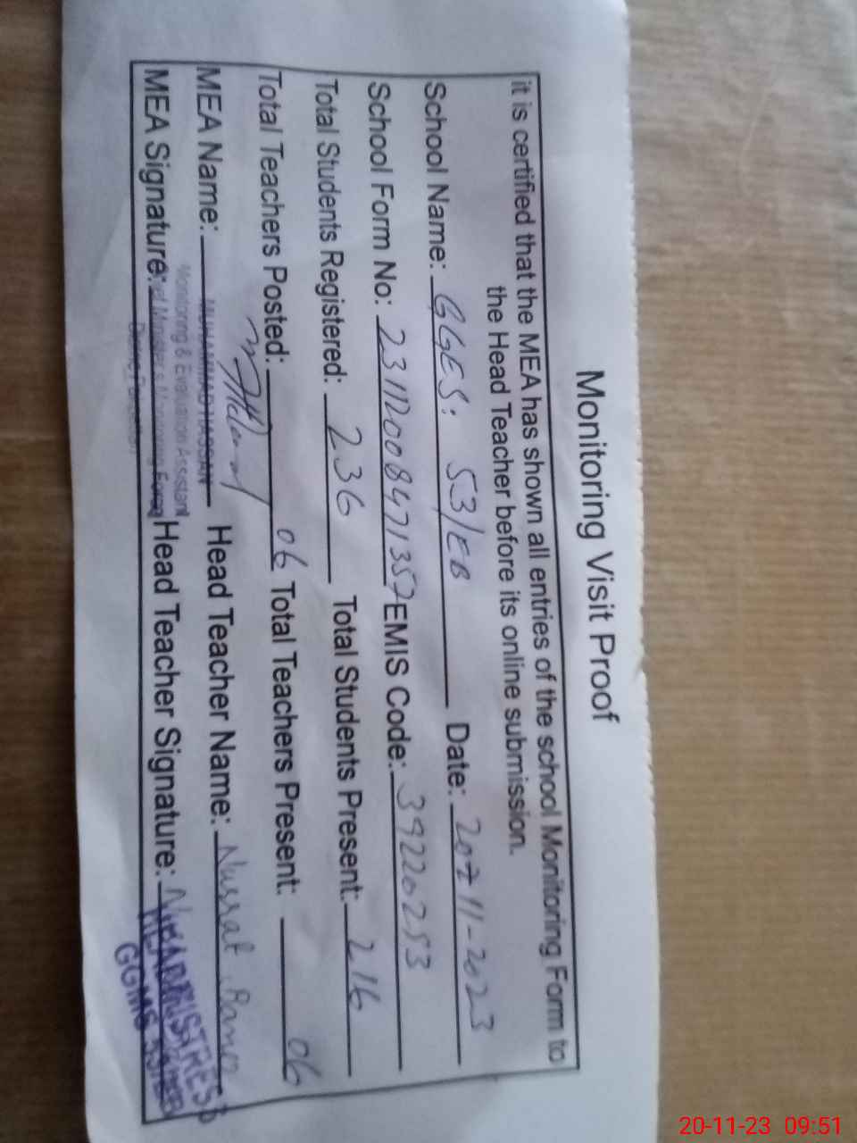 | Attendance Register | Head Teacher | MEA with School | Visit Proof |