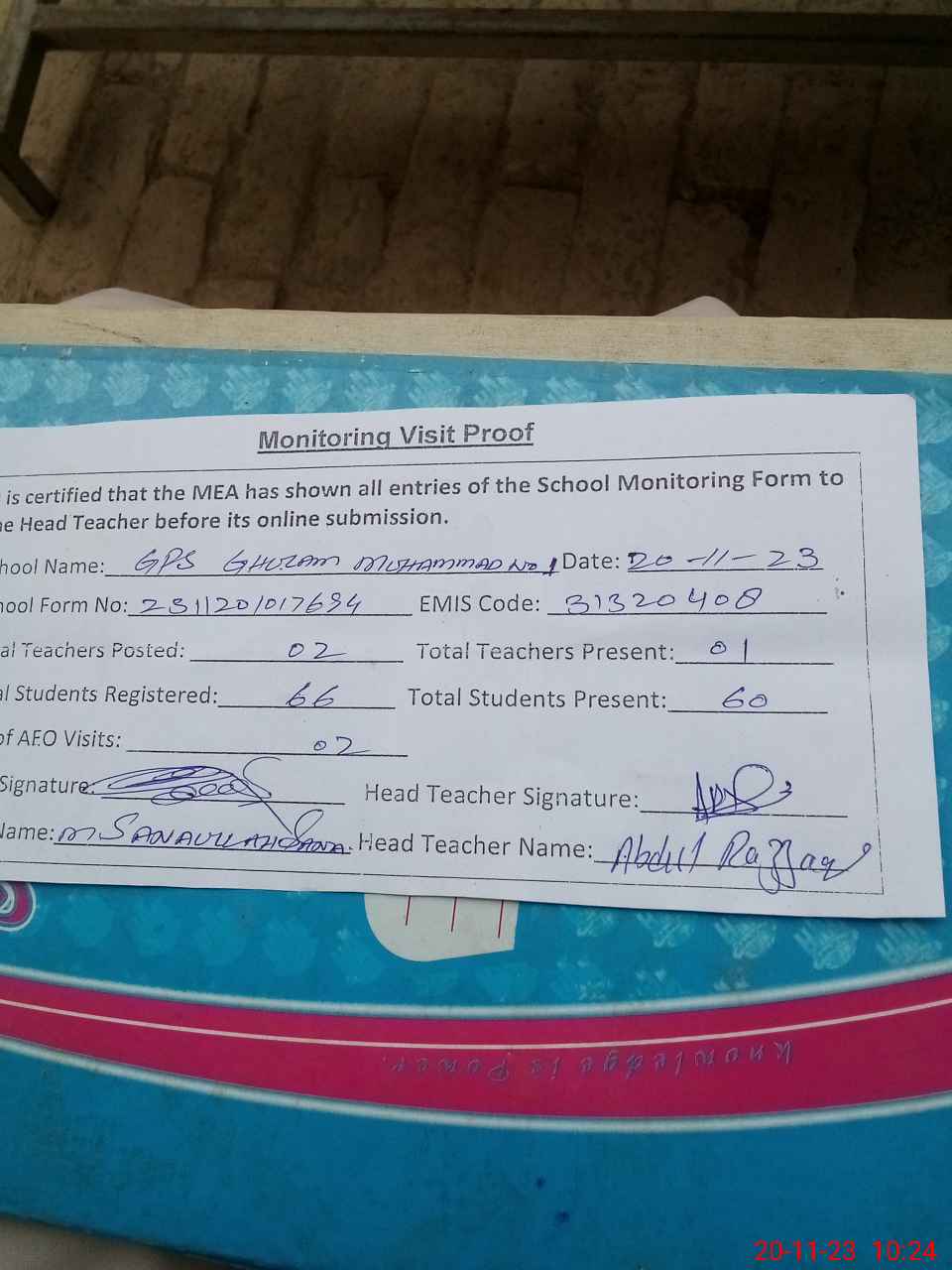 | Attendance Register | Head Teacher | MEA with School | Visit Proof |