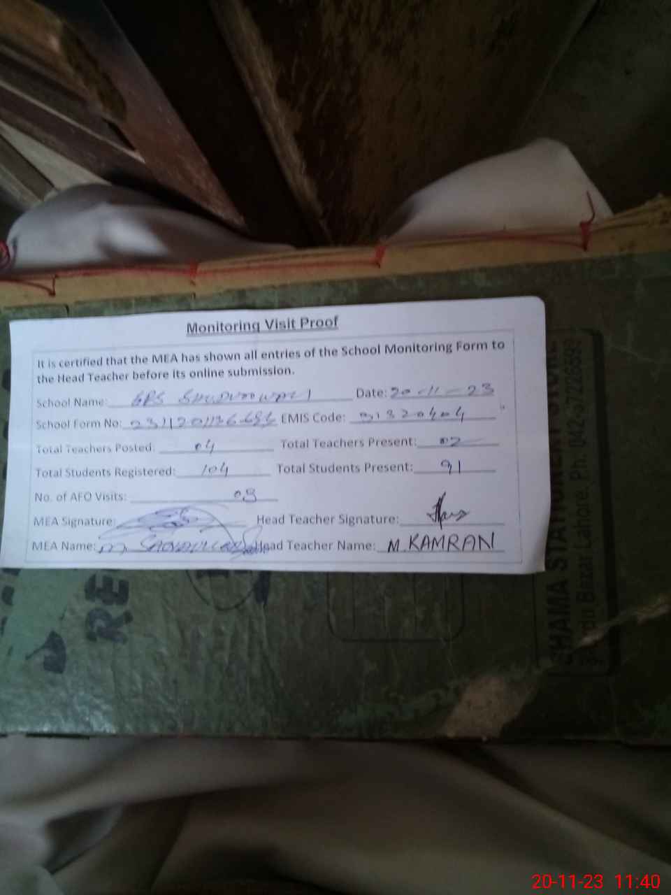 | Attendance Register | Head Teacher | MEA with School | Visit Proof |