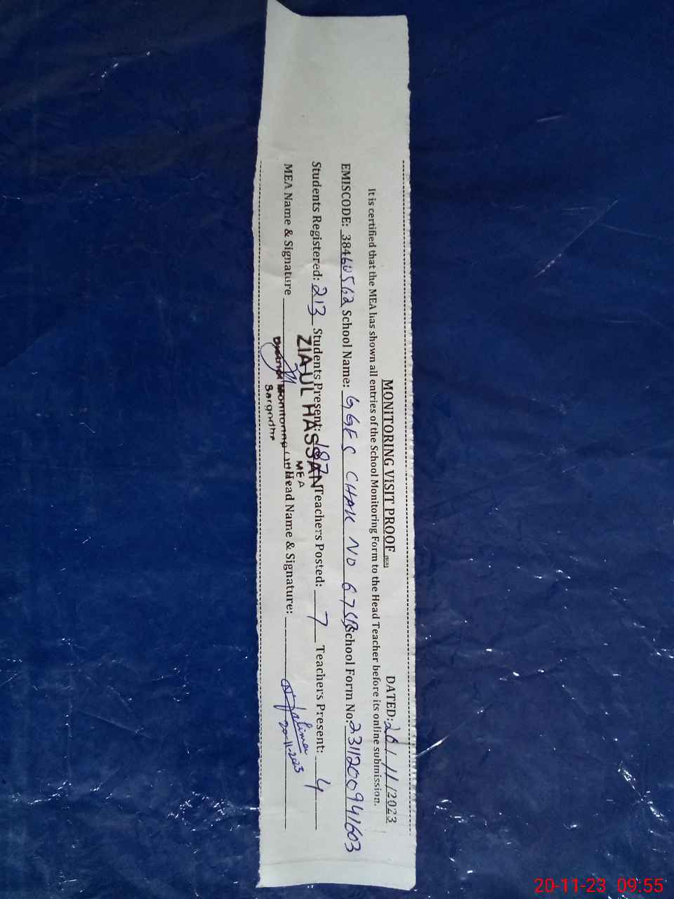 | Attendance Register | Head Teacher | MEA with School | Visit Proof |