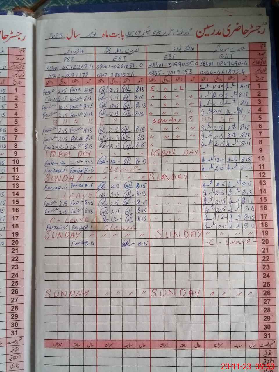 | CNIC | Full Name | Designation | R/C | Absence During Last Calender Month |