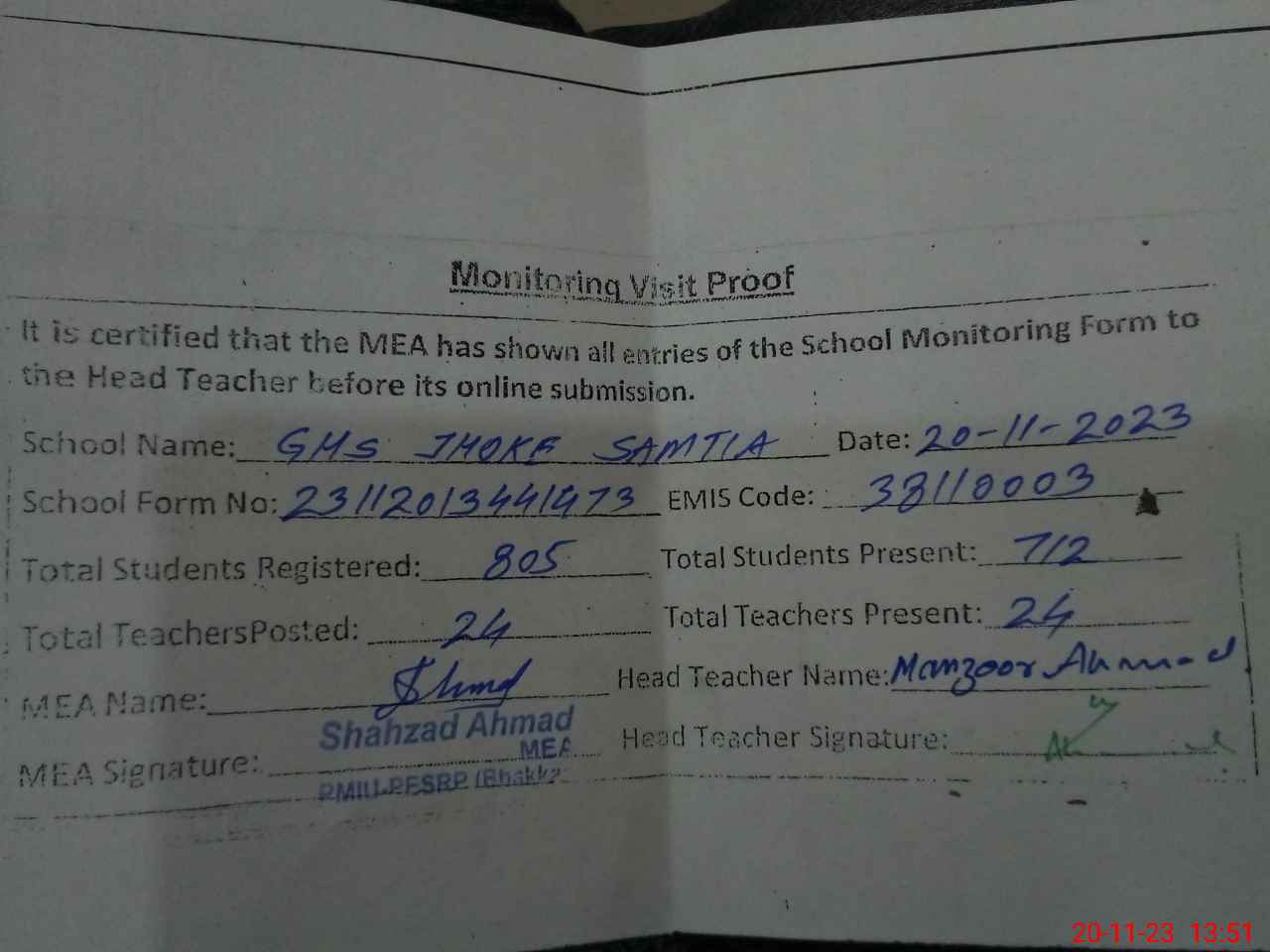 | EMIS Code: 38110003 | Name of School: GHS JHOKE SAMTIA | |||