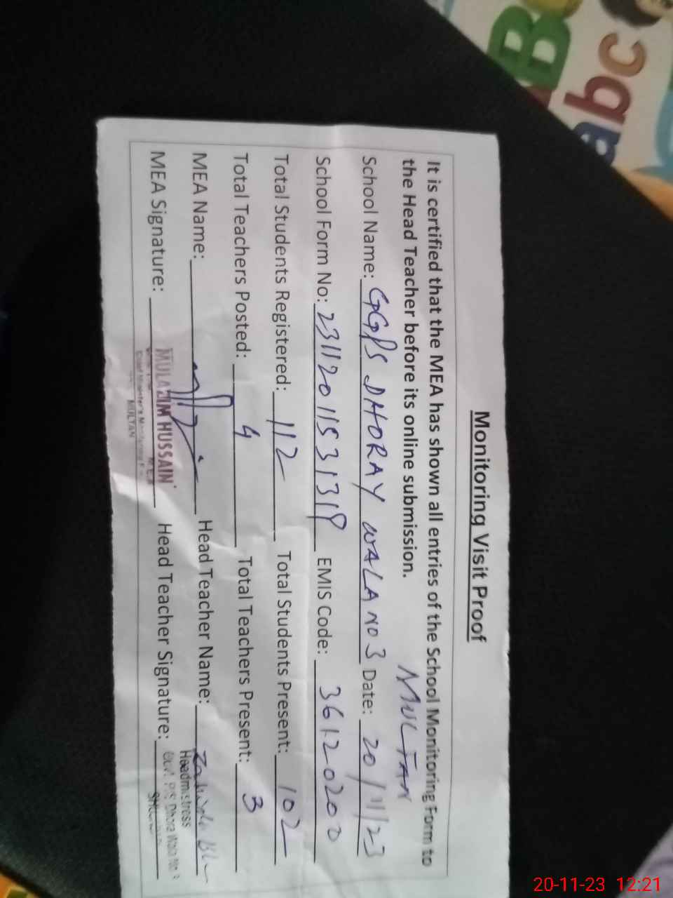 | Attendance Register | Head Teacher | MEA with School | Visit Proof |