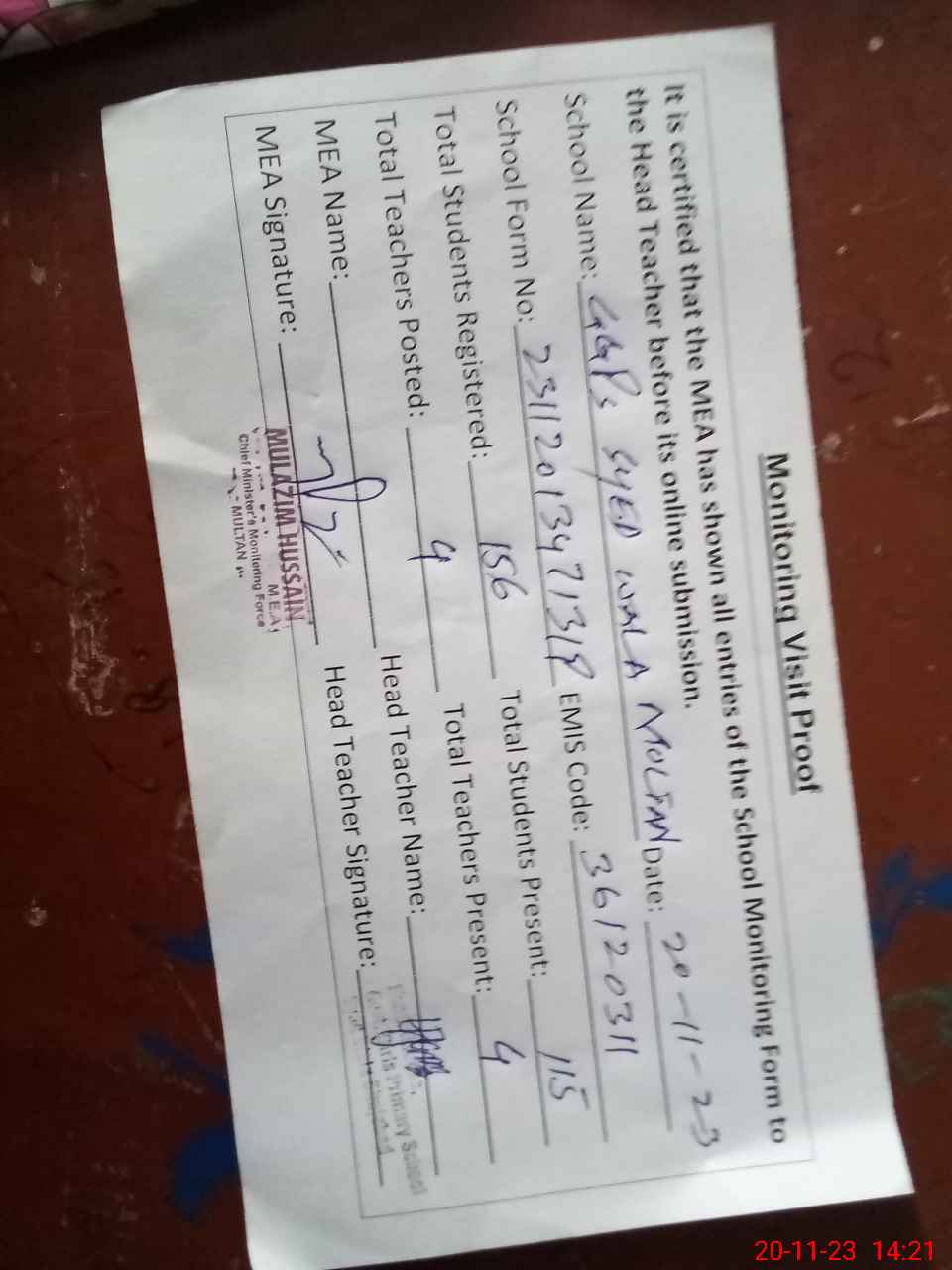 | EMIS Code: 36120311 | Name of School: GGPS SYED WALA SHUJABAD | |||