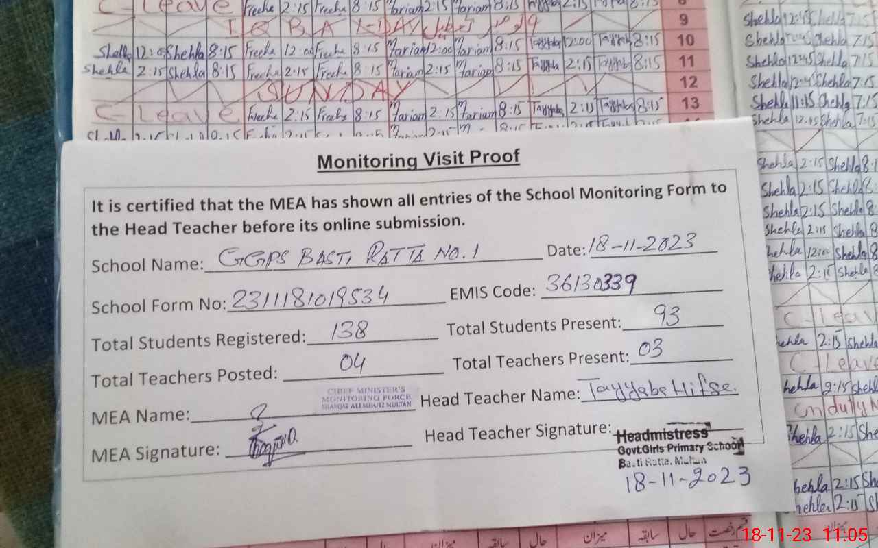 | Monitoring Date: 18-11-2023 | Start Time: 18-11-2023 10:18 AM | End Time: 18-11-2023 11:05 AM | Name of MEA: SH**** AL**** | |