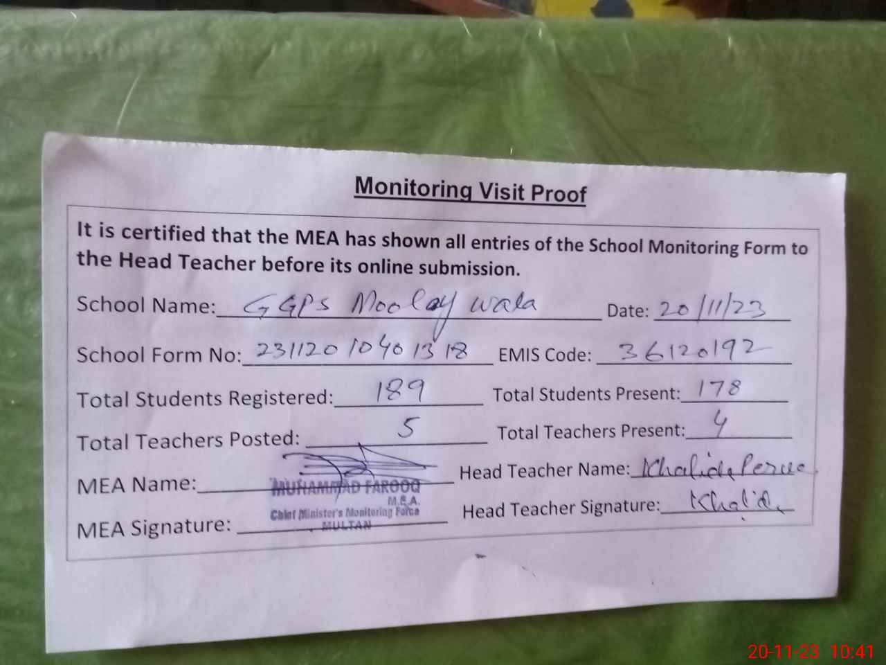 | Attendance Register | Head Teacher | MEA with School | Visit Proof |