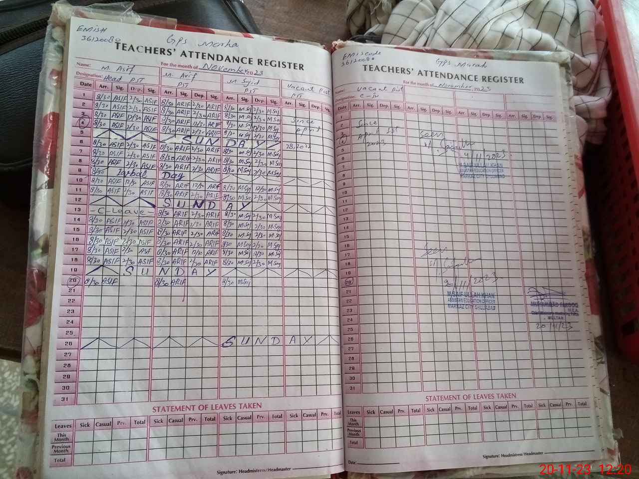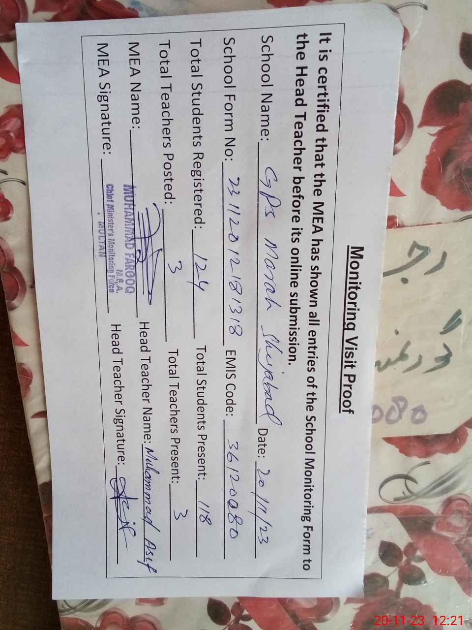| Attendance Register | Head Teacher | MEA with School | Visit Proof |