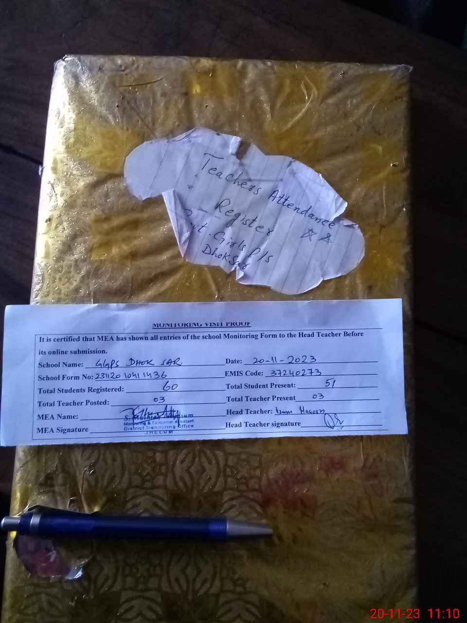 | Attendance Register | Head Teacher | MEA with School | Visit Proof |