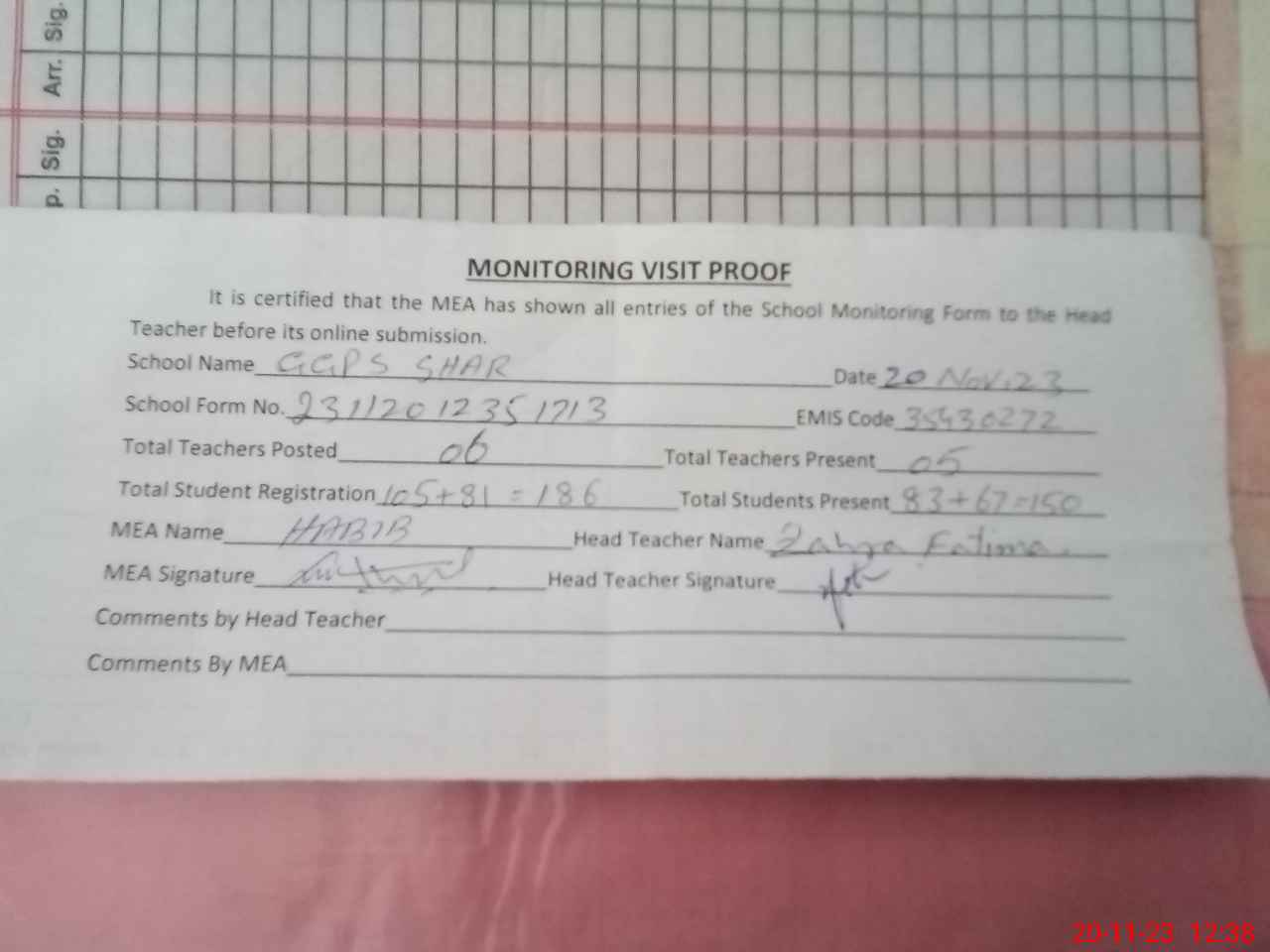 | Attendance Register | Head Teacher | MEA with School | Visit Proof |
