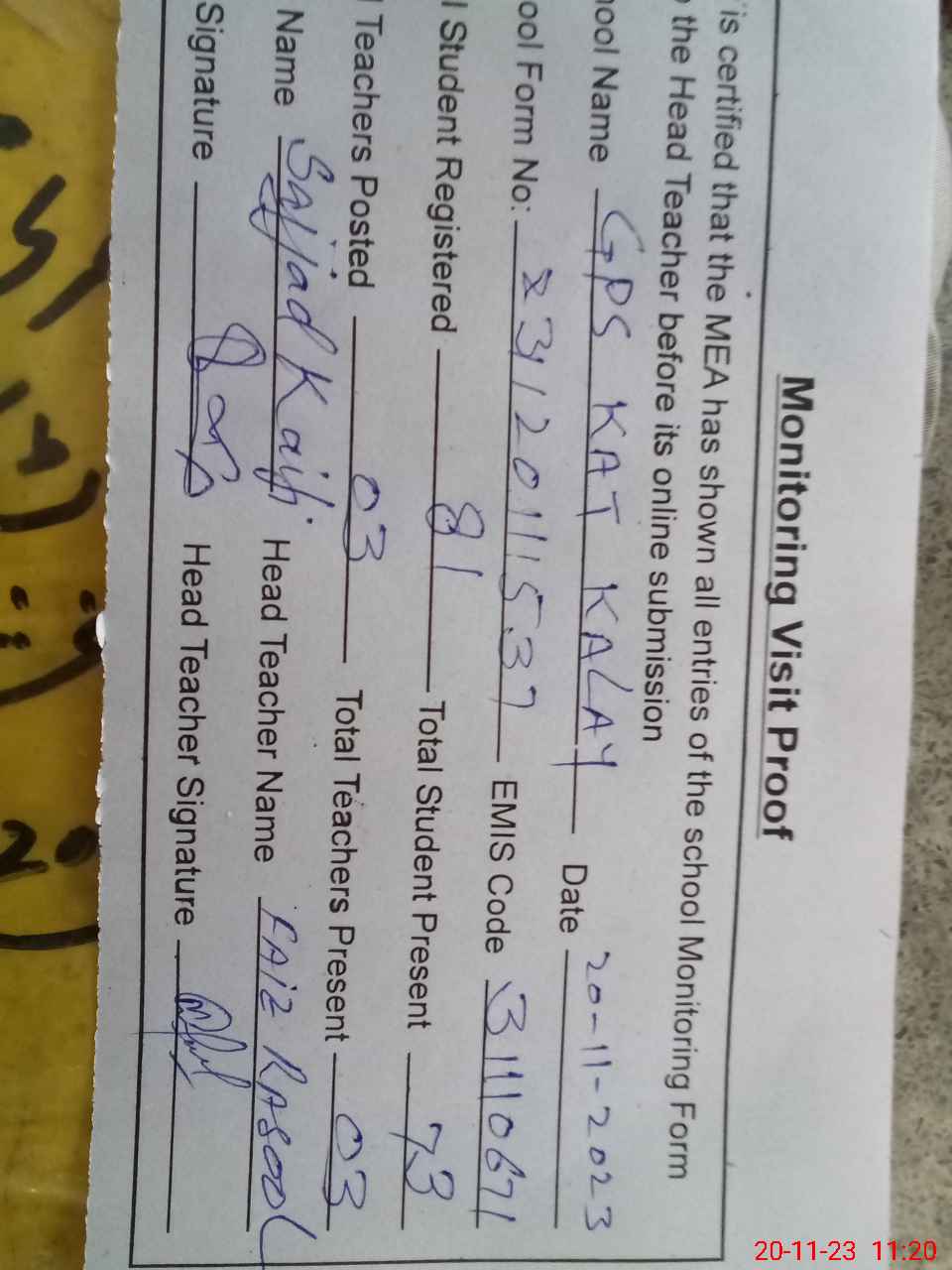 | Attendance Register | Head Teacher | MEA with School | Visit Proof |