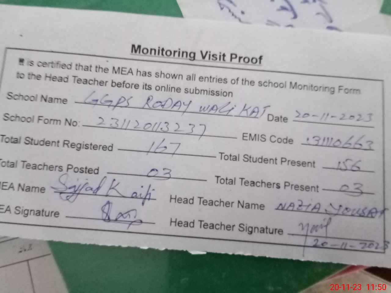 | EMIS Code: 31110663 | Name of School: GGPS RODAY WALI KAT | |||