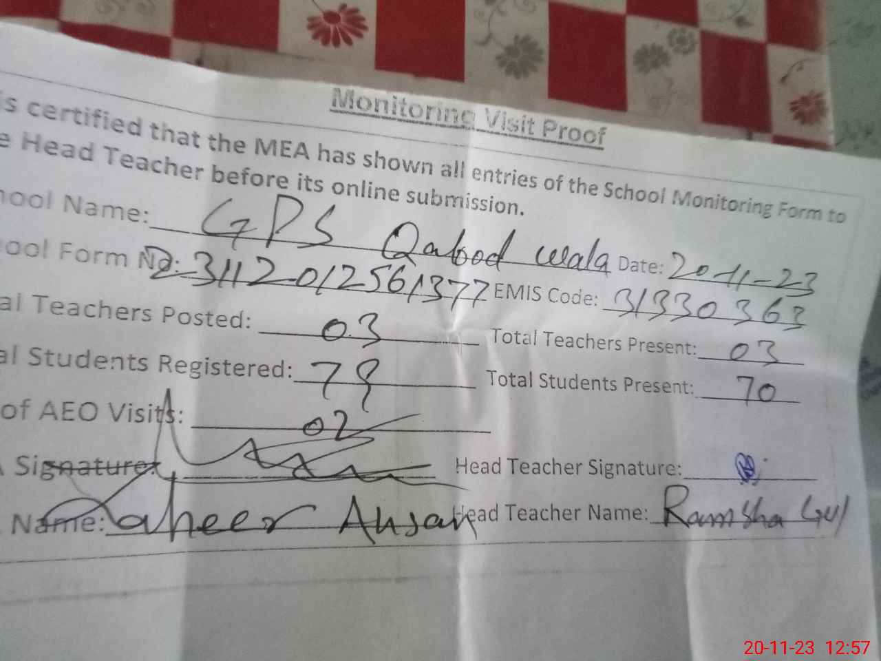 | Attendance Register | Head Teacher | MEA with School | Visit Proof |