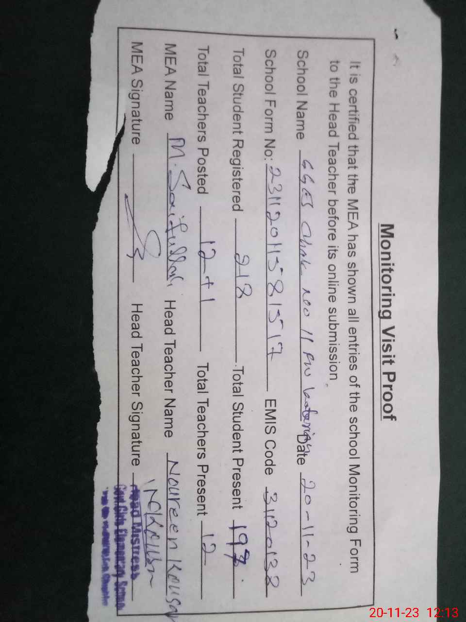 | EMIS Code: 31120138 | Name of School: GGES CHAK NO. 11/FW KATARIAN | |||