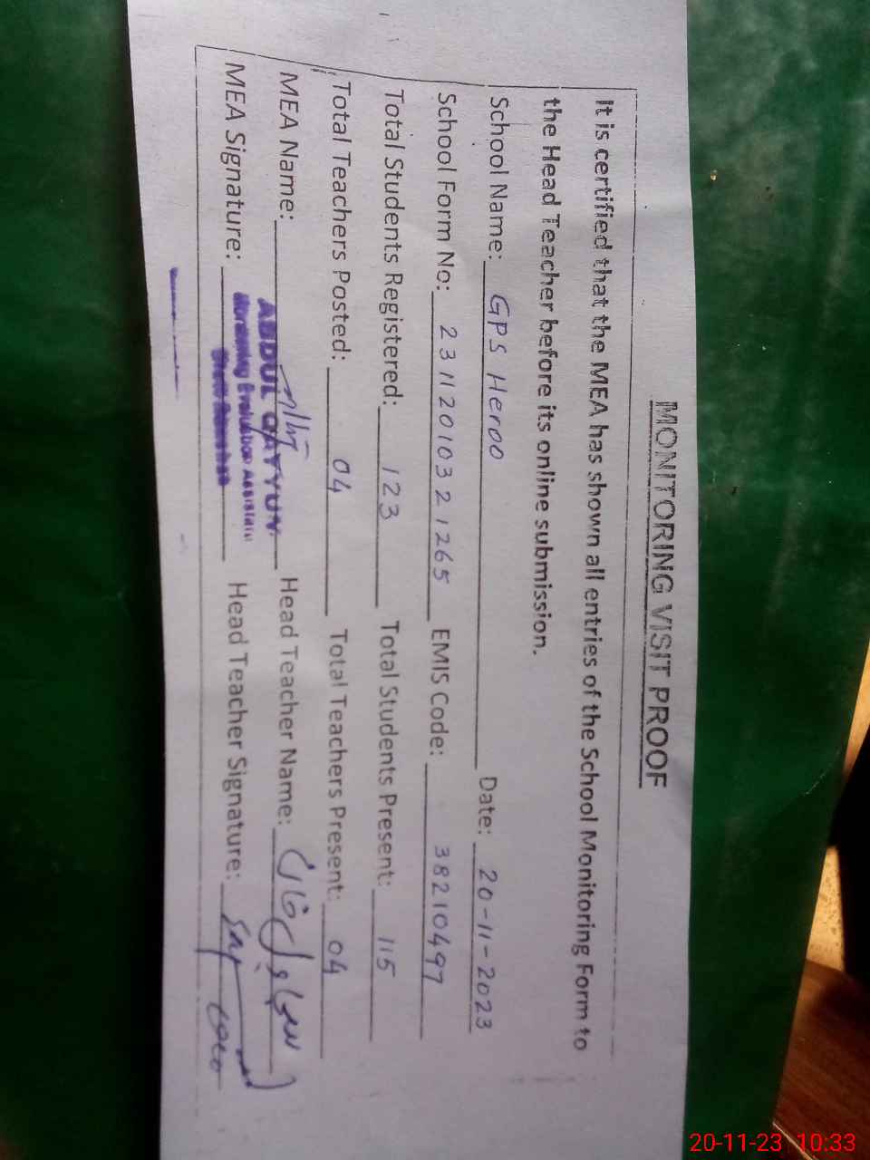 | Attendance Register | Head Teacher | MEA with School | Visit Proof |