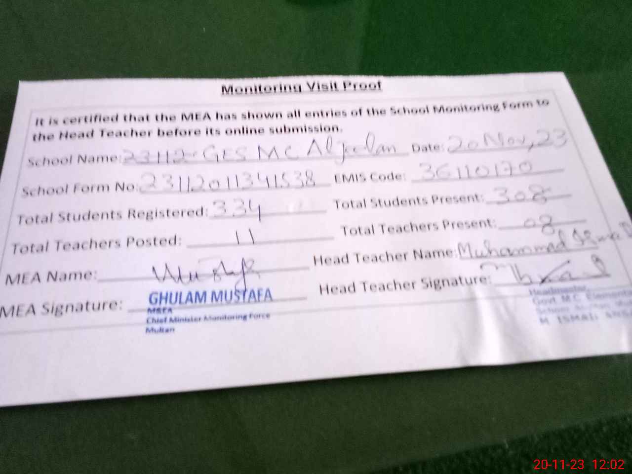 | EMIS Code: 36110170 | Name of School: GES MC AL-JEELLAN WALA MULTAN | |||