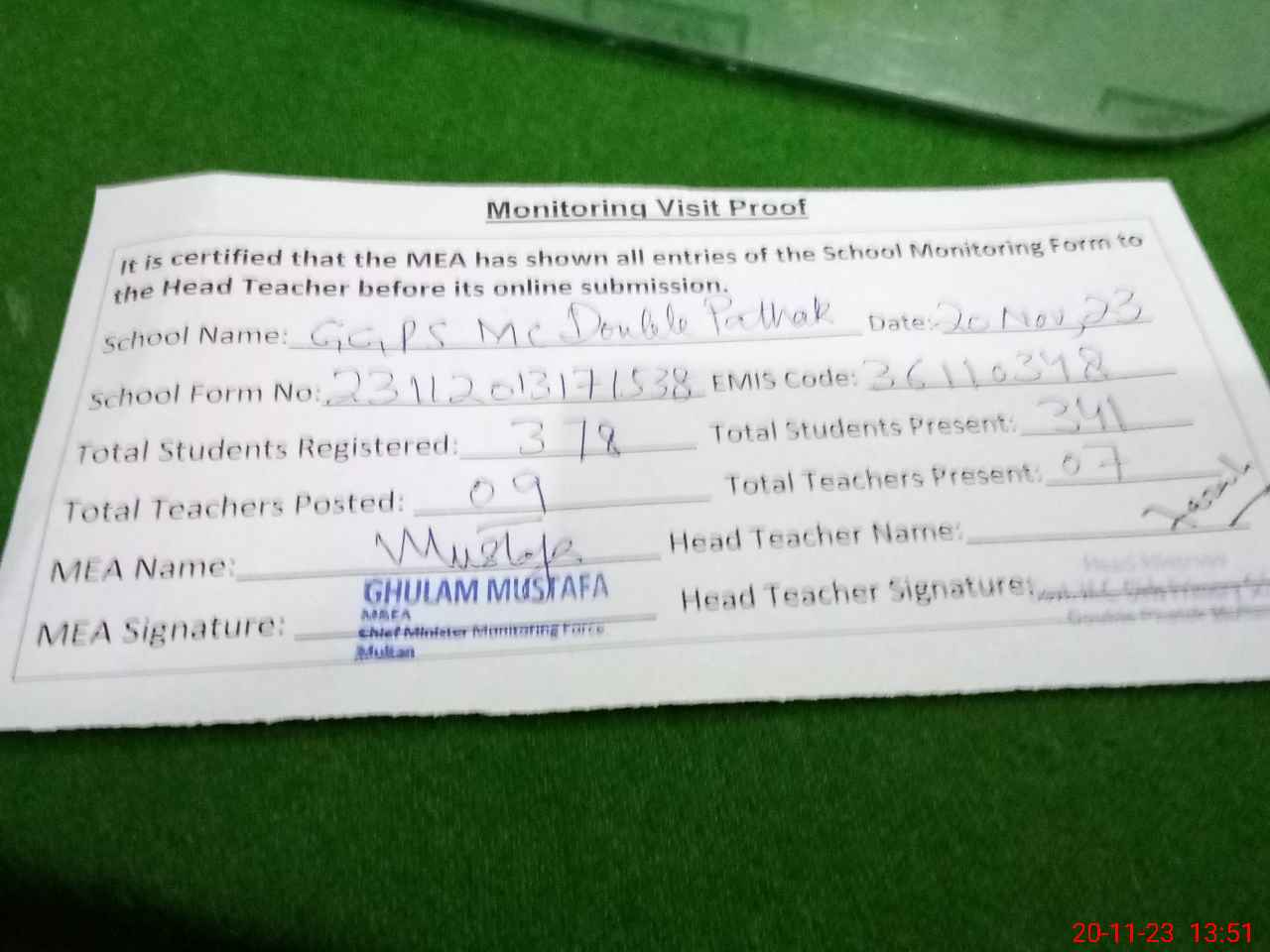 | EMIS Code: 36110348 | Name of School: GGPS MC DOUBLE PHATAK MULTAN | |||