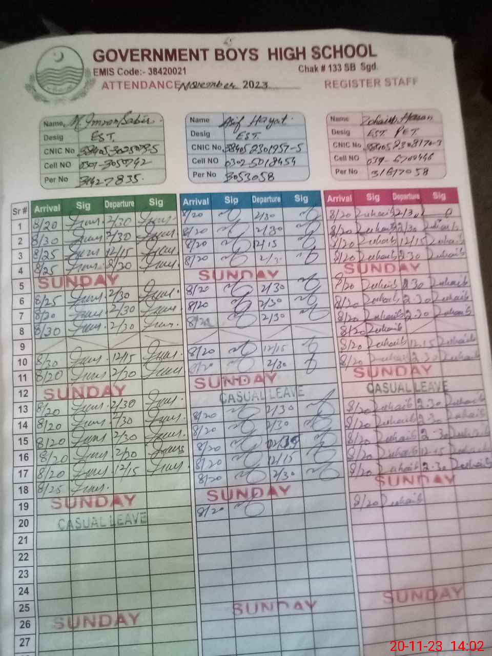 | CNIC | Full Name | Designation | R/C | Absence during last cal. month |