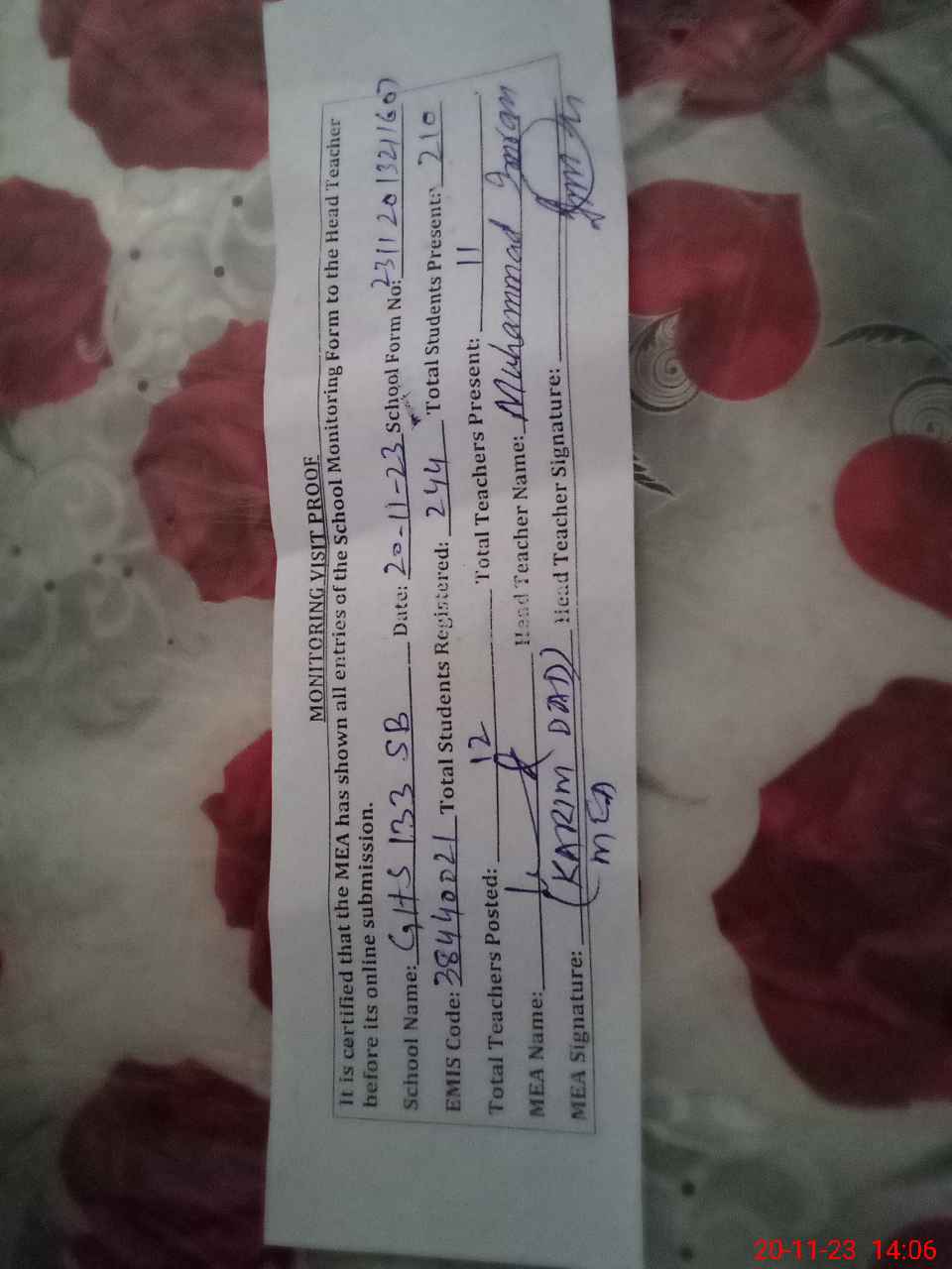 | Attendance Register | Head Teacher | MEA with School | Visit Proof |