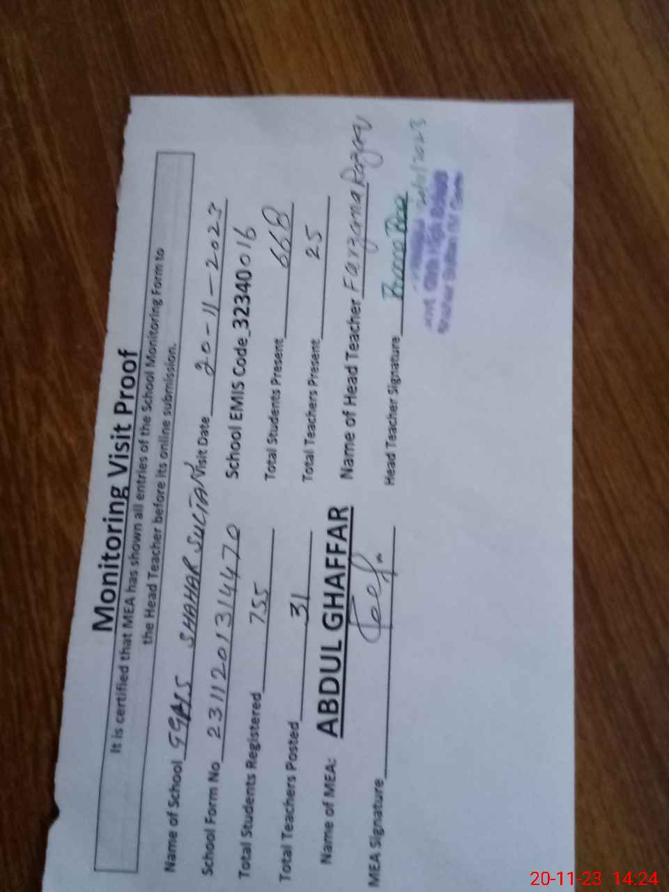 | Attendance Register | Head Teacher | MEA with School | Visit Proof |