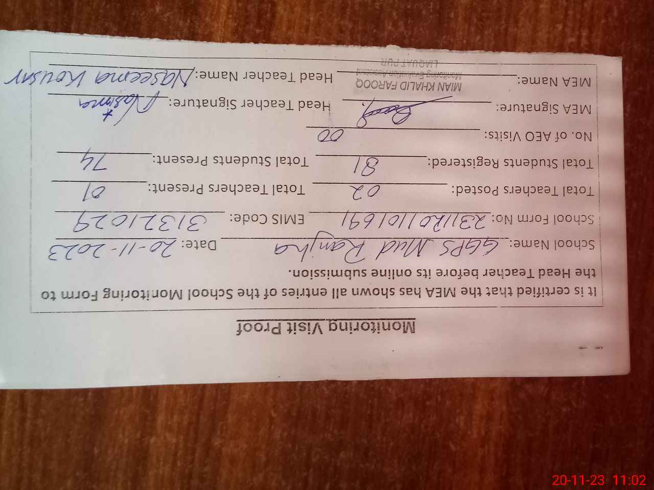 | Attendance Register | Head Teacher | MEA with School | Visit Proof |