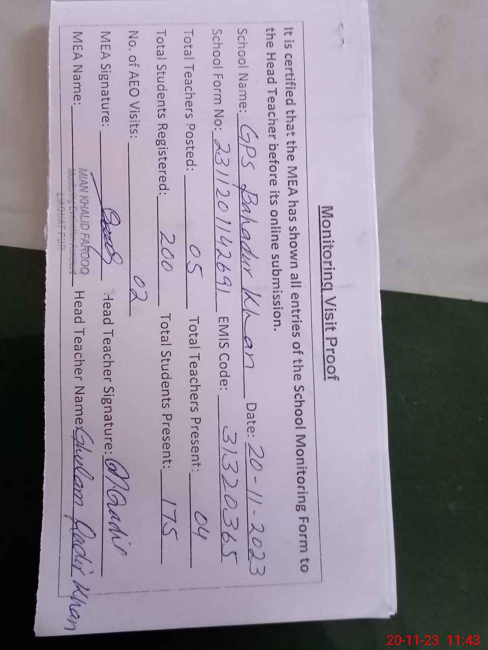 | Attendance Register | Head Teacher | MEA with School | Visit Proof |
