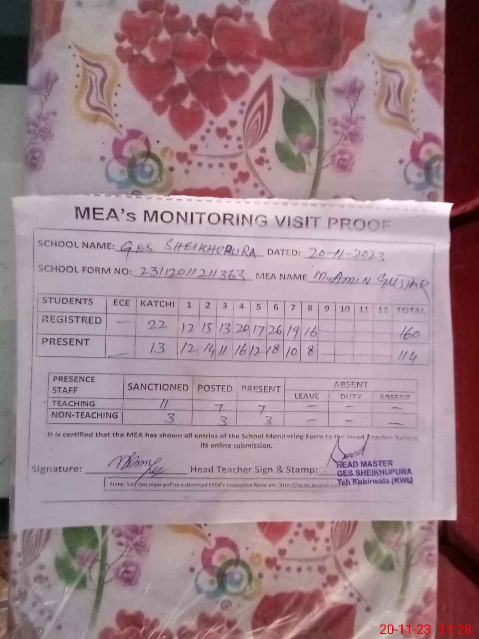 | Attendance Register | Head Teacher | MEA with School | Visit Proof |