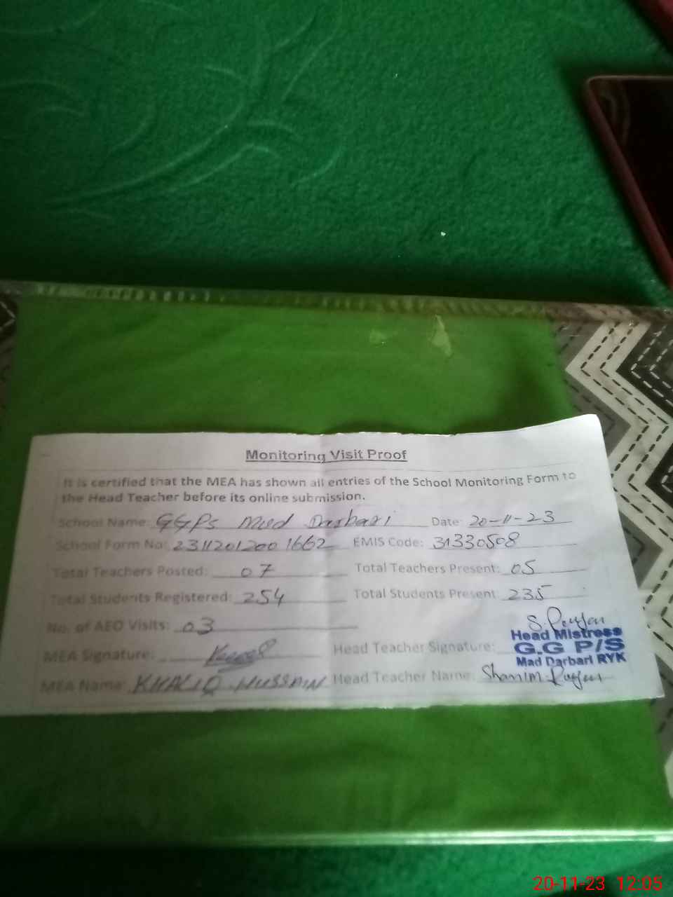 | EMIS Code: 31330508 | Name of School: GGPS MUD DARBARI | |||