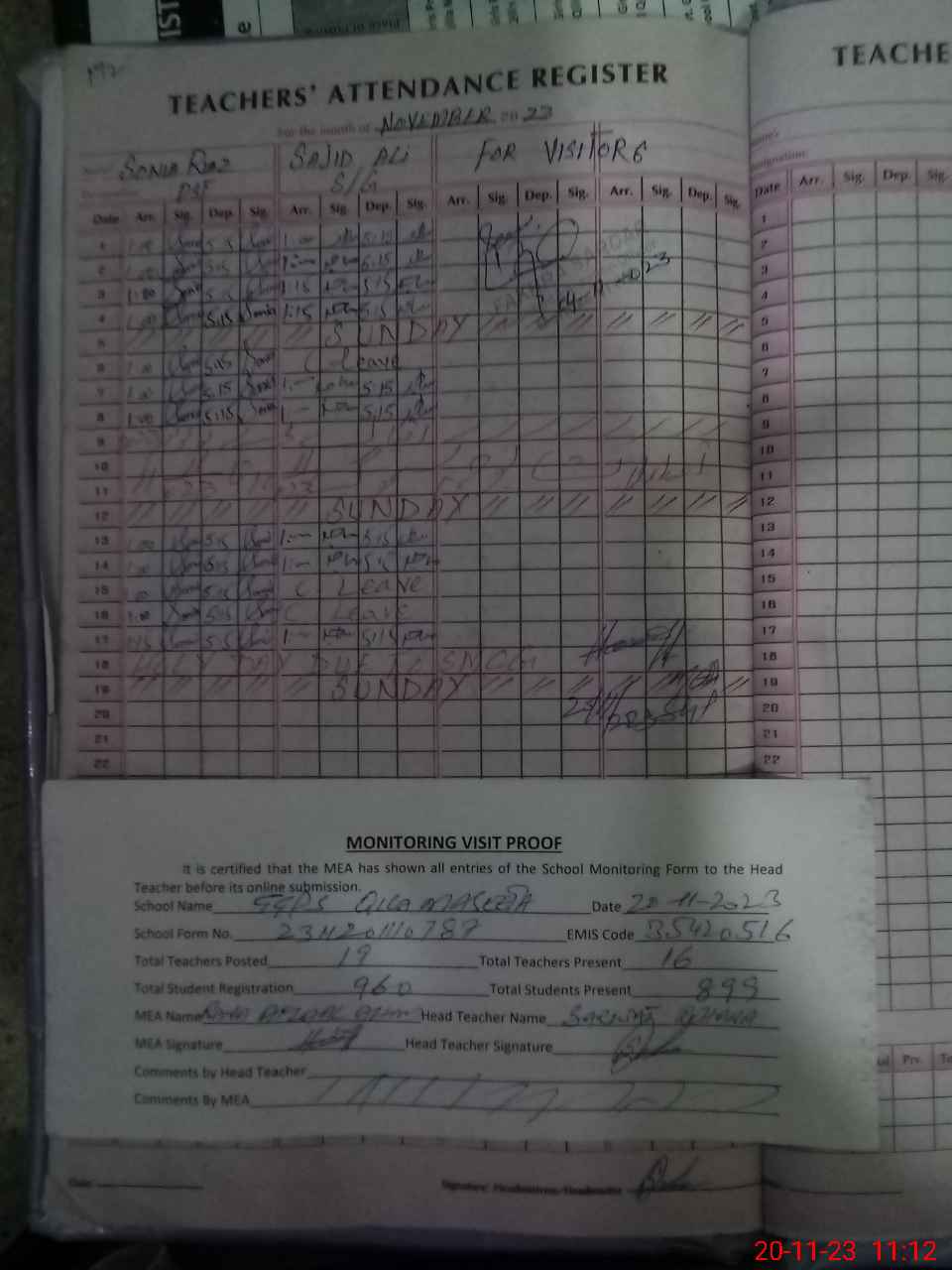 | Attendance Register | Head Teacher | MEA with School | Visit Proof |
