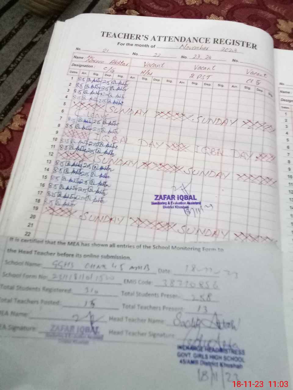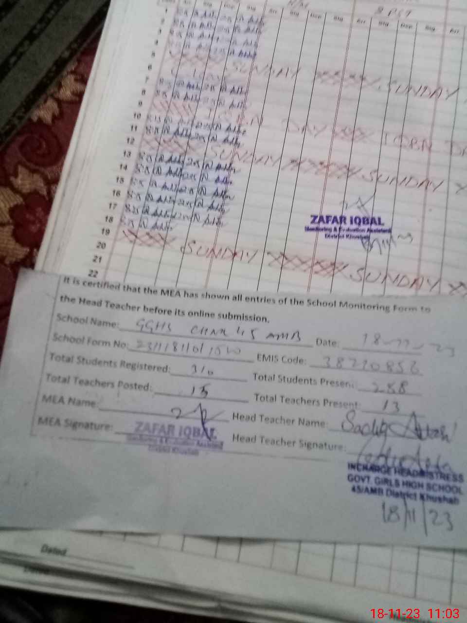 | Attendance Register | Head Teacher | MEA with School | Visit Proof |