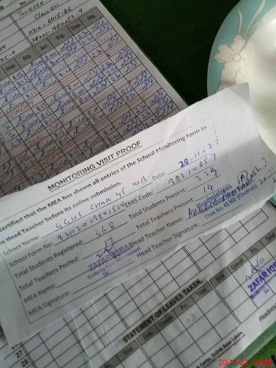 | Attendance Register | Head Teacher | MEA with School | Visit Proof |