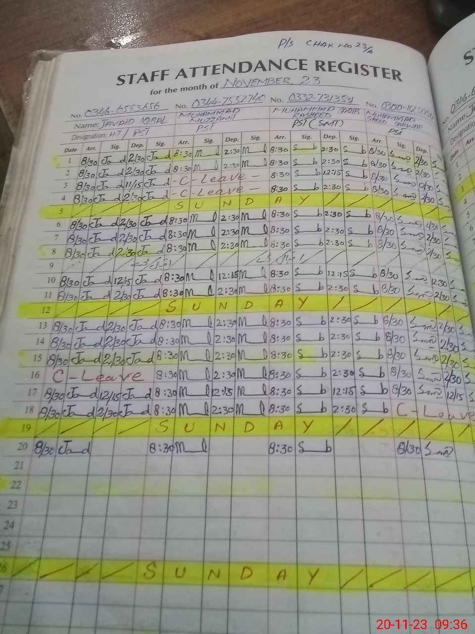 | CNIC | Full Name | Designation | R/C | Absence during last cal. month |