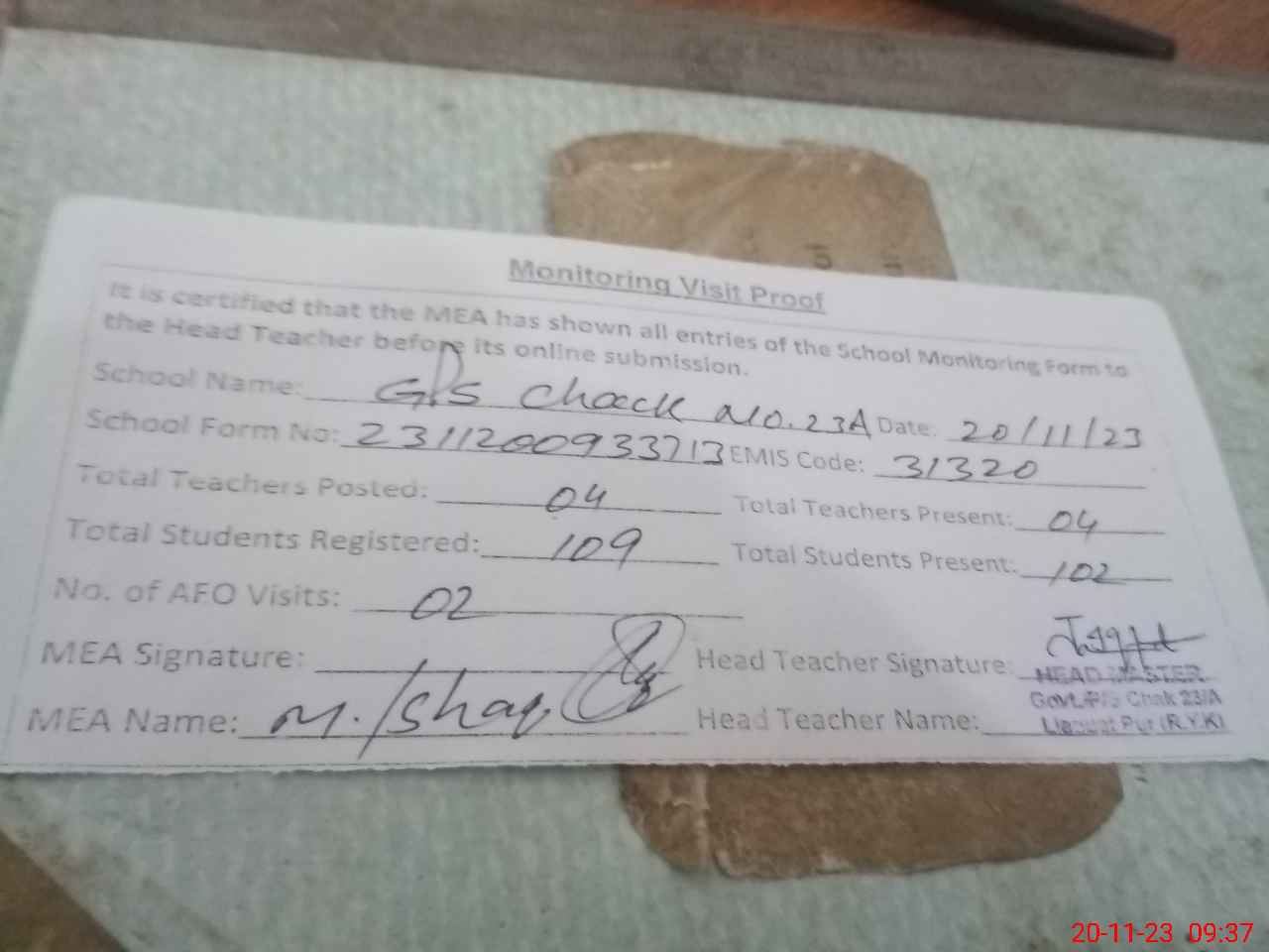 | Attendance Register | Head Teacher | MEA with School | Visit Proof |