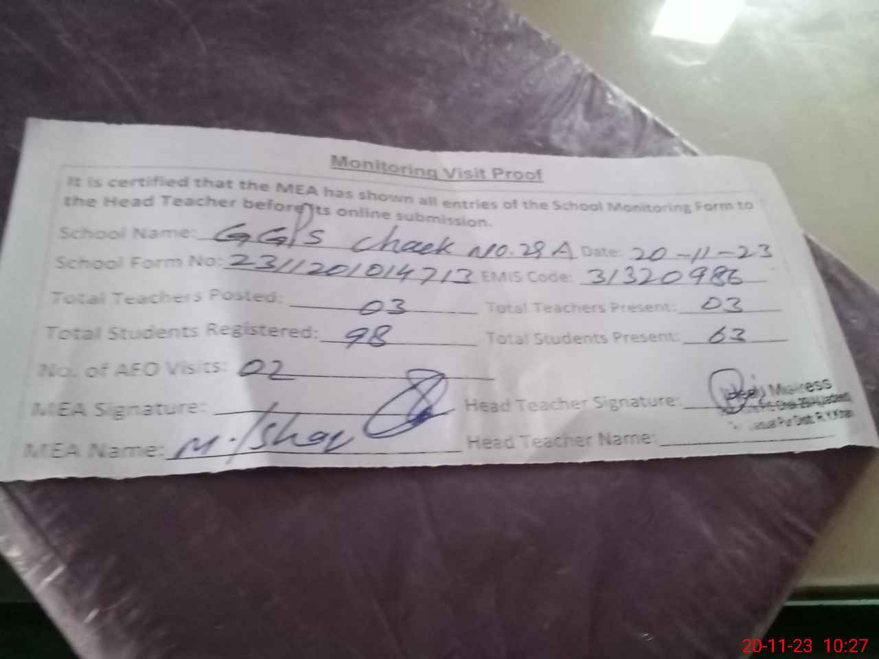| Attendance Register | Head Teacher | MEA with School | Visit Proof |