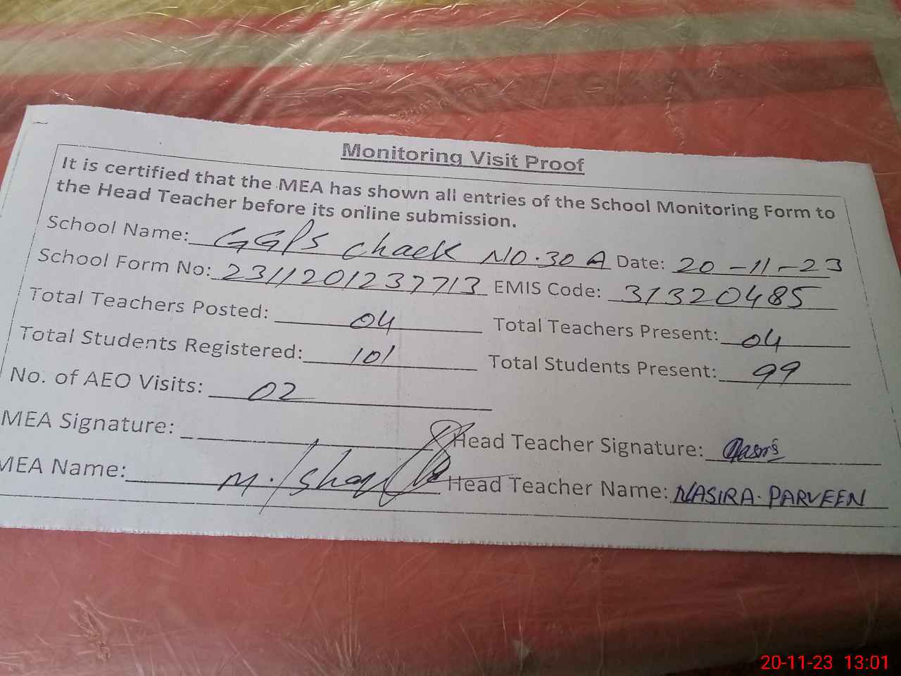 | Attendance Register | Head Teacher | MEA with School | Visit Proof |